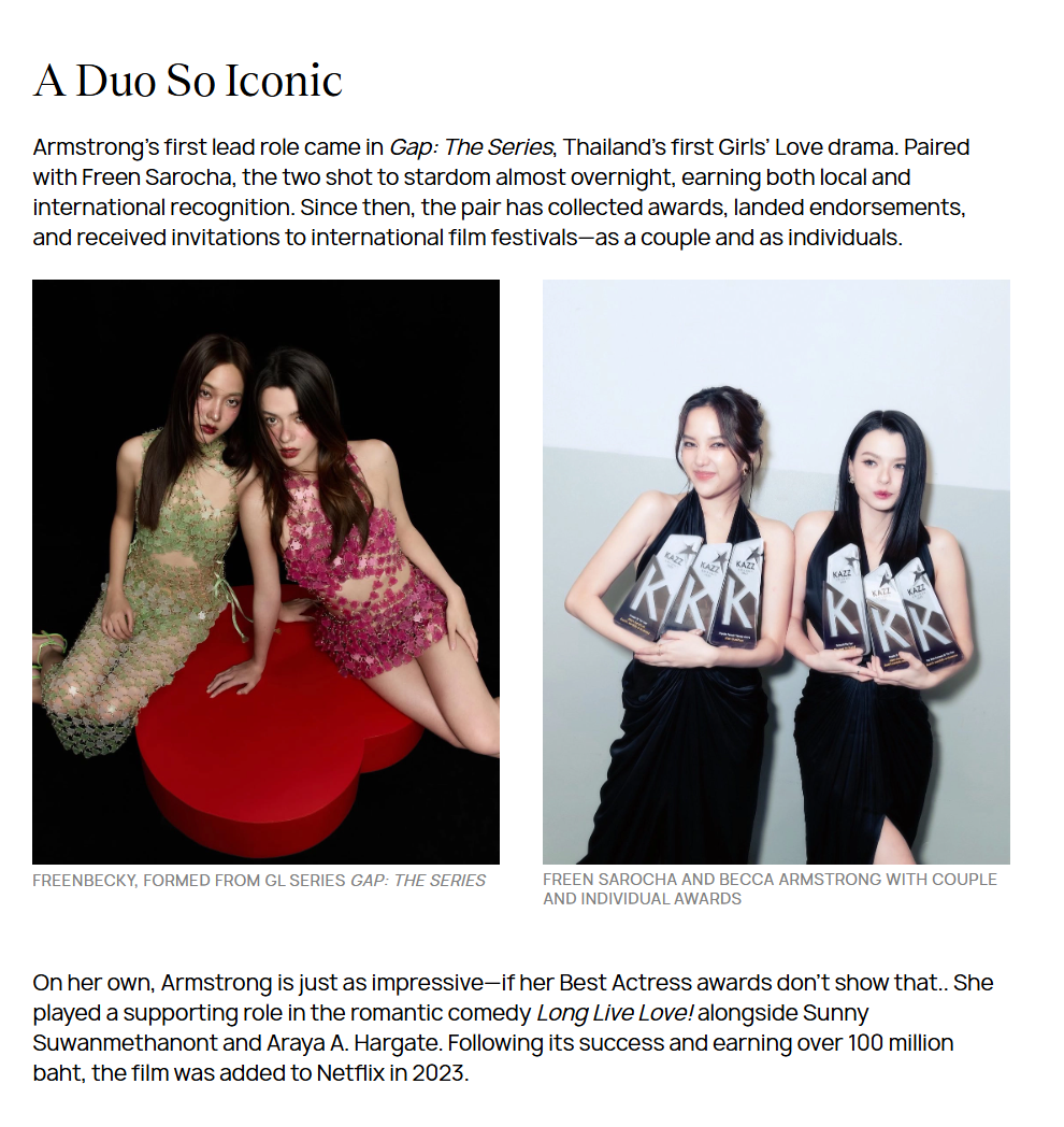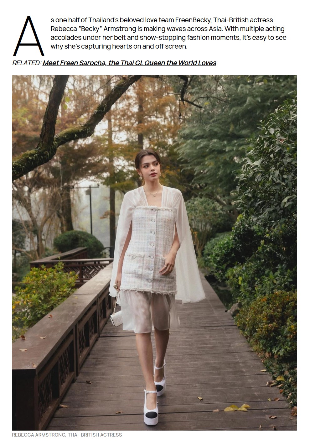 รีเบคก้า “เบ็คกี้” อาร์มสตรอง นักแสดงสาวลูกครึ่งไทย-อังกฤษ หนึ่งในสมาชิกทีม FreenBecky อันเป็นที่รักของคนไทย กำลังสร้างกระแสไปทั่วเอเชีย ด้วยรางวัลการแสดงมากมายและโมเมนต์แฟชั่นสุดปัง จึงไม่น่าแปลกใจว่าทำไมเธอถึงครองใจผู้ชมทั้งบนจอและนอกจอ