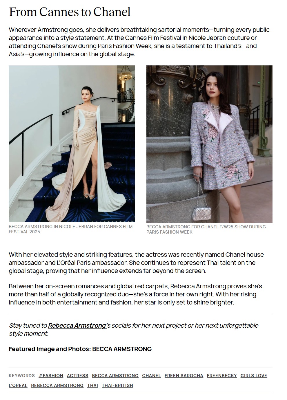 ไม่ว่าอาร์มสตรองจะไปที่ไหน เธอก็สามารถถ่ายทอดช่วงเวลาแห่งการแต่งกายอันน่าทึ่งได้ เปลี่ยนการปรากฏตัวต่อสาธารณชนทุกครั้งให้กลายเป็นสไตล์ที่โดดเด่น ไม่ว่าจะเป็นในเทศกาลภาพยนตร์เมืองคานส์ในชุดกูตูร์ของนิโคล เจบรัน หรือในการแสดงของ CHANEL ในช่วงสัปดาห์แฟชั่นปารีส เธอคือเครื่องพิสูจน์ถึงอิทธิพลที่เติบโตอย่างต่อเนื่องของประเทศไทยและเอเชียบนเวทีโลก