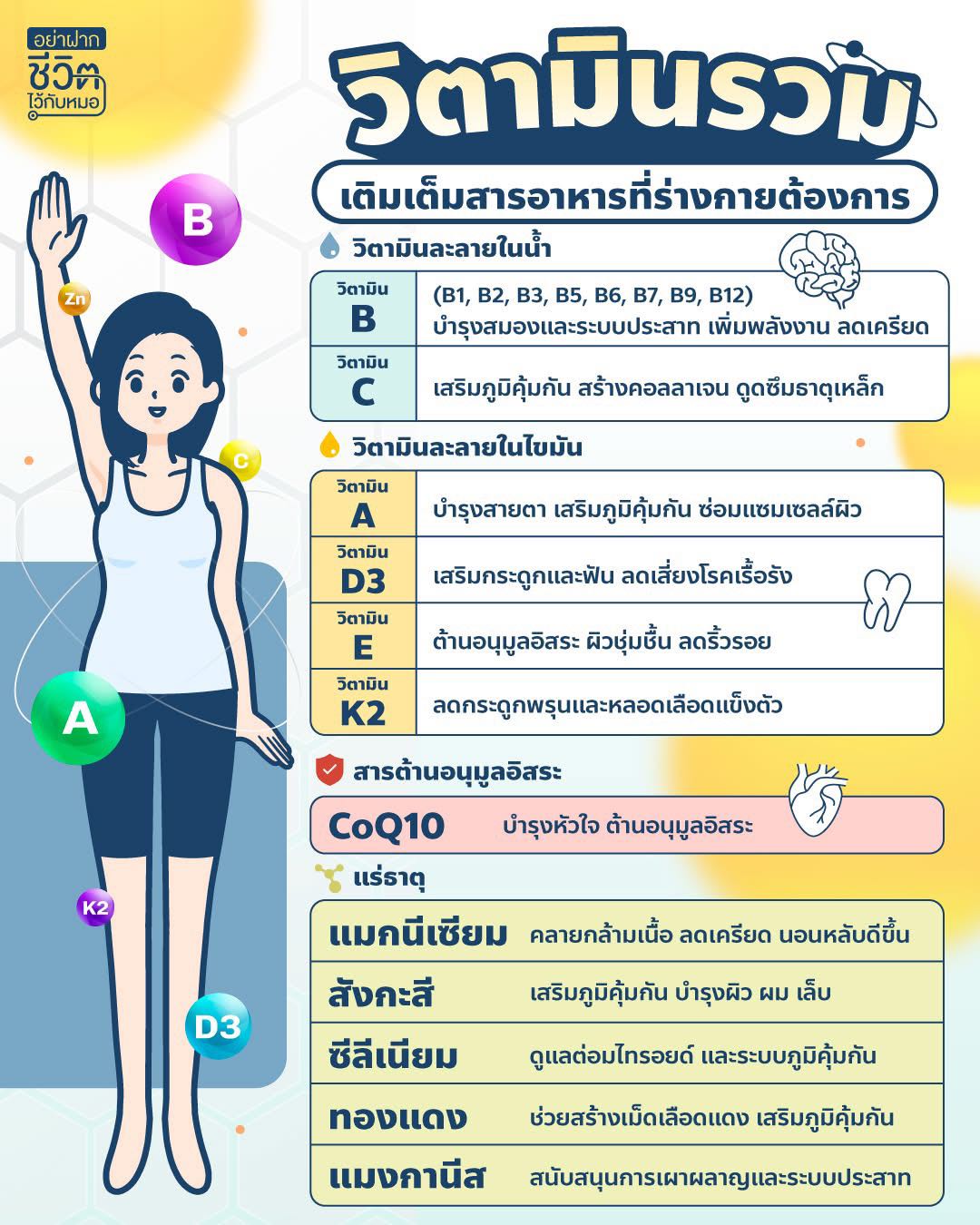 วิตามินรวมเปรียบเสมือนขุมทรัพย์แห่งสุขภาพที่รวบรวมวิตามินและแร่ธาตุที่จำเป็นไว้ด้วยกัน ซึ่งแต่ละชนิดต่างมีบทบาทสำคัญต่อการทำงานของร่างกายในส่วนต่าง ๆ ตั้งแต่หัวจรดเท้า