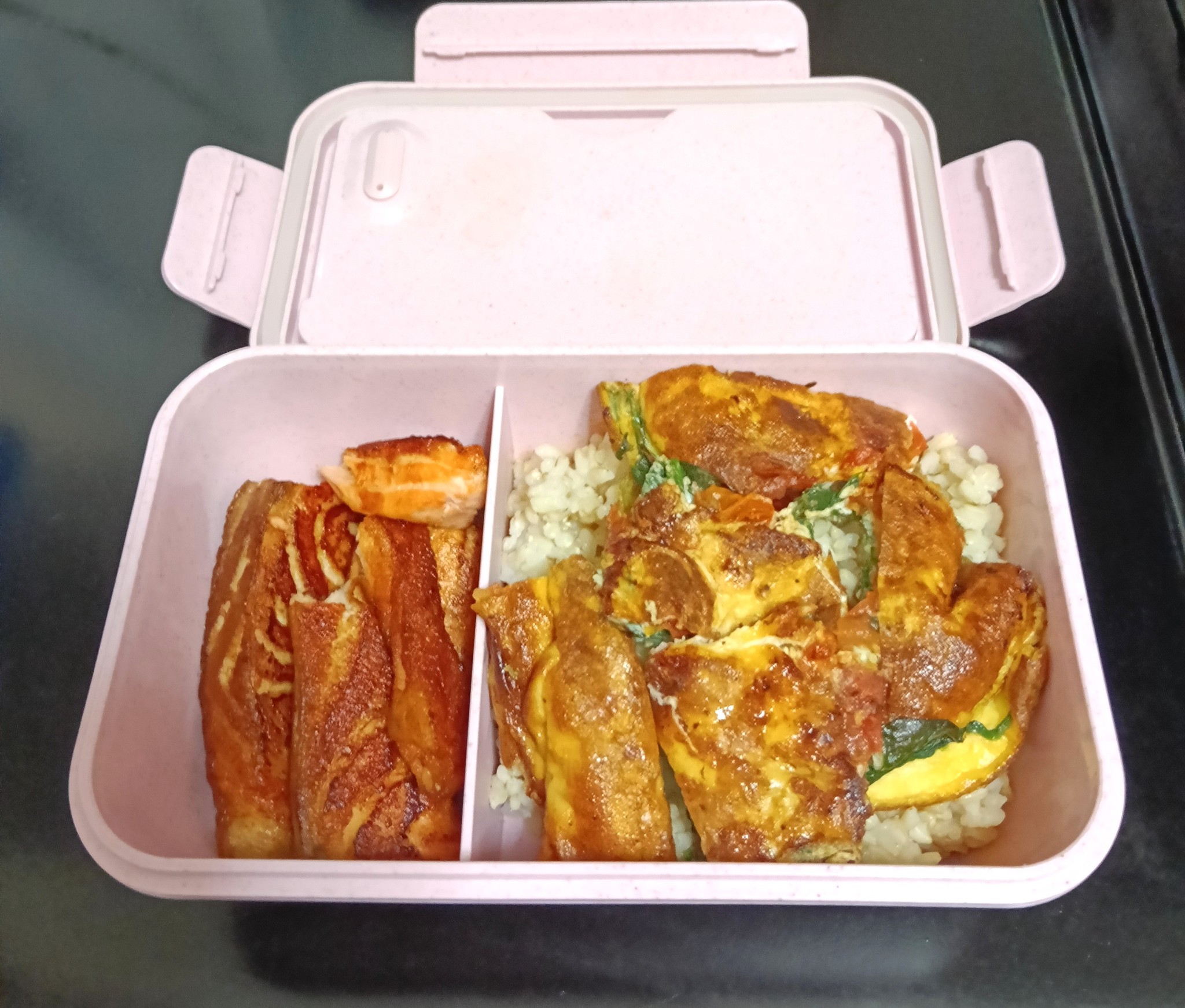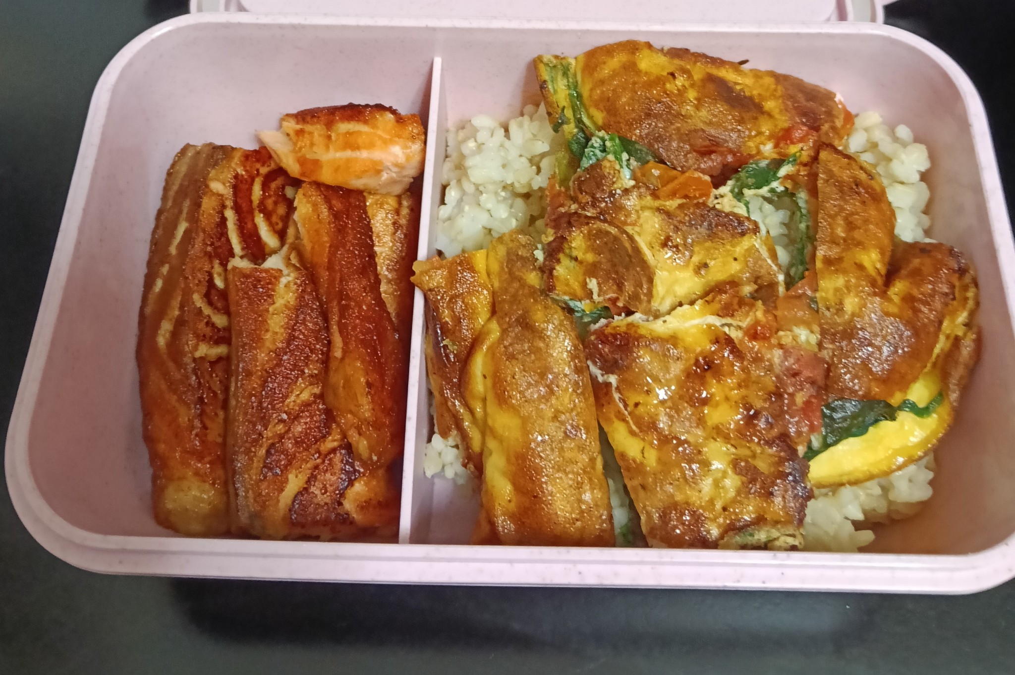 วันนี้เมนู "ข้าวกล้อง แซลม่อนย่าง ไข่เจียวมะเขือเทศผักโขม"