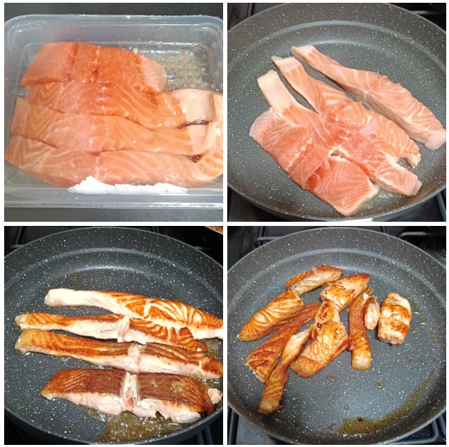 ล้างทำความสะอาดปลาแซลม่อนในน้ำเกลือเพื่อดับกลิ่นคาว ตั้งกระทะให้ร้อน จากนั้นก็ย่างในกระทะเลยค่ะ ใสเกลือเล็กน้อย ใครชอบพริกไทยก็ใส่พริกไทยลงไปด้วยก็ได้นะคะ