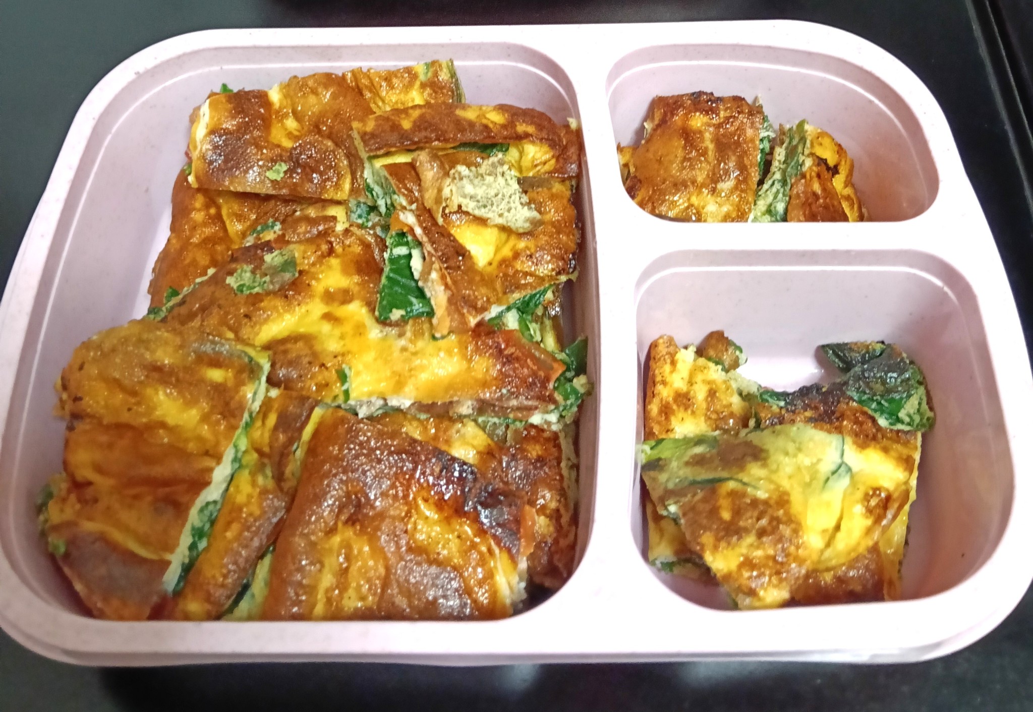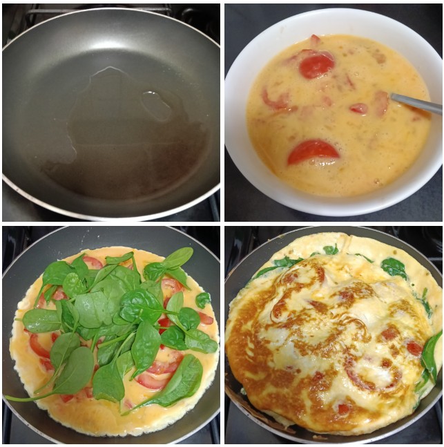 ตามมาด้วยไข่เจียวมะเขือเทศผักโขม ตอนแรกกะว่าจะใส่แค่มะเขือเทศแต่พอดูไปดูมาแล้ว ผักน้อยไป ก็เลยใส่ผักโขมเพิ่มลงไปด้วยดีกว่า