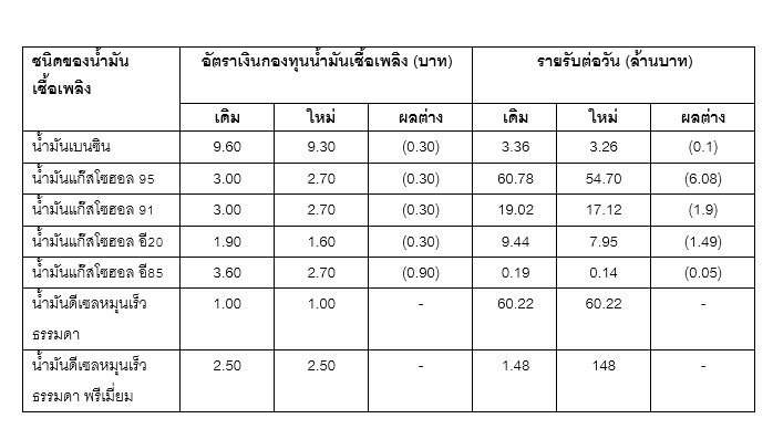 โดยลดราคาขายปลีกน้ำมันดีเซลลง 50 สตางค์/ลิตร จาก 31.44 บาท/ลิตร เป็น 30.94 บาท/ลิตร นอกจากนี้ยังมีการปรับลดราคาขายปลีกน้ำมันเบนซินลงทุกชนิด 30 สตางค์/ลิตร เพื่อให้ประชาชนได้รับประโยชน์โดยตรงจากการบริหารจัดการราคาพลังงานอย่างทันท่วงที ภายใต้หลักการทำงาน “เปิดเผย-โปร่งใส-ตรวจสอบได้” ของ กบน. และสำนักงานกองทุนน้ำมันเชื้อเพลิง (สกนช.) โดยมีรายละเอียดในตาราง ดังนี้