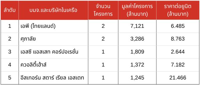 ตารางจัดอันดับบริษัทในตลาดหลักทรัพย์และบริษัทในเครือที่มีมูลค่าโครงการมากที่สุด 5 อันดับ ดังนี้