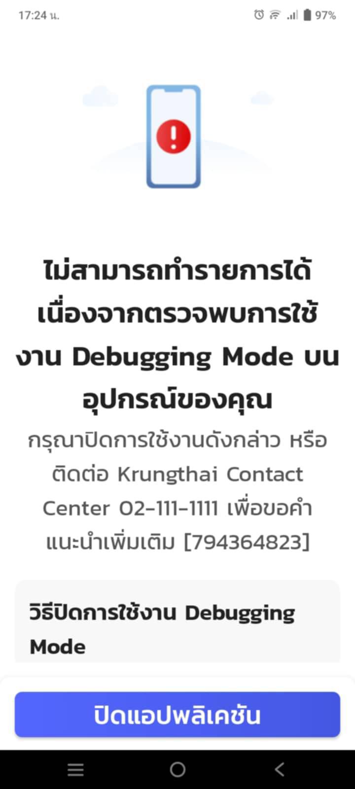สมัครแอพเป๋าตังไม่ได้ บอกว่าตรวจเจอDeugging Mode บนอุปกรณ์ ของคุณ