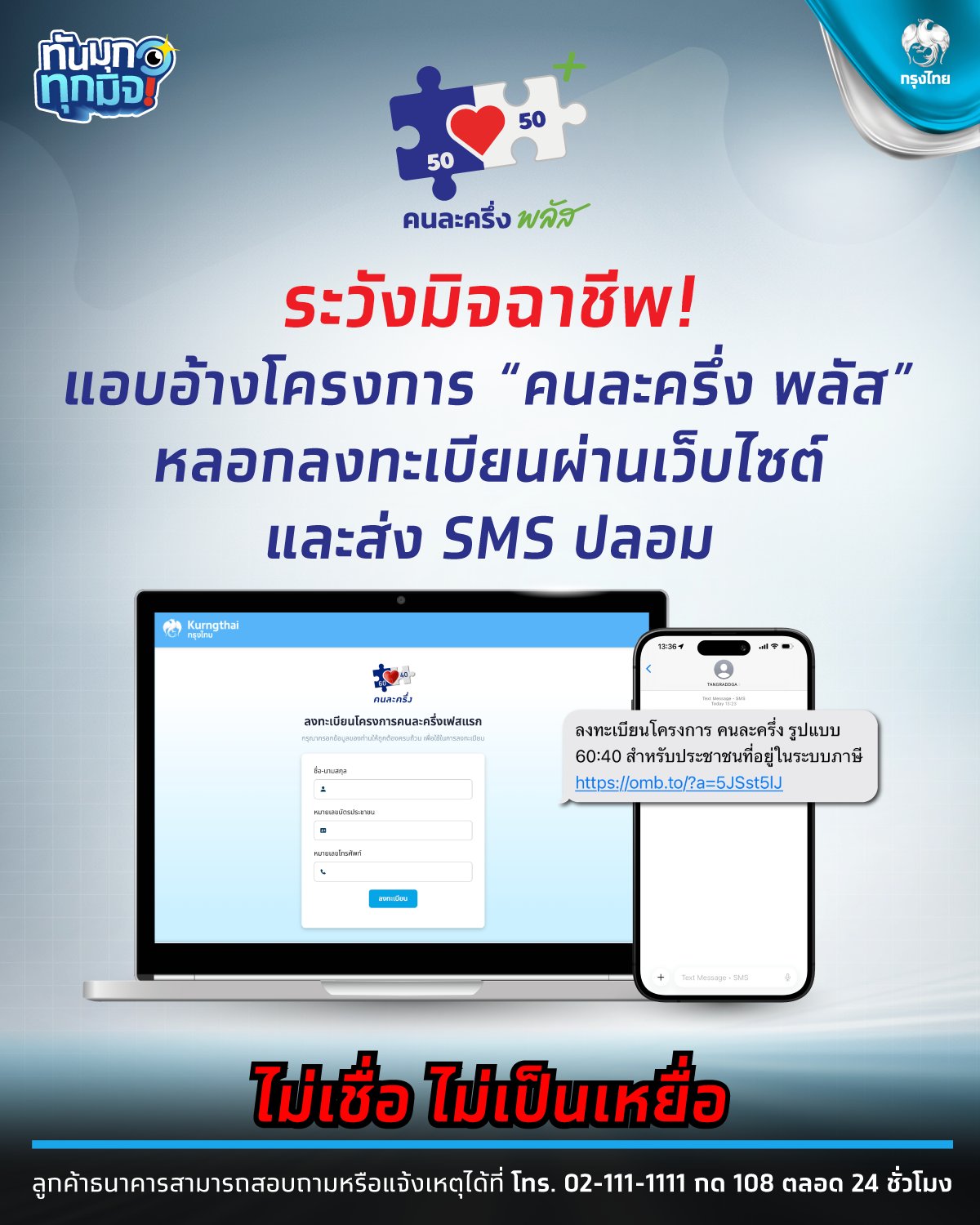 ธนาคารกรุงไทย แจ้งเตือนให้ระวังมิจฉาชีพ! แอบอ้างโครงการ “คนละครึ่ง พลัส” หลอกให้ลงทะเบียนผ่านเว็บไซต์ และส่ง SMS ปลอม