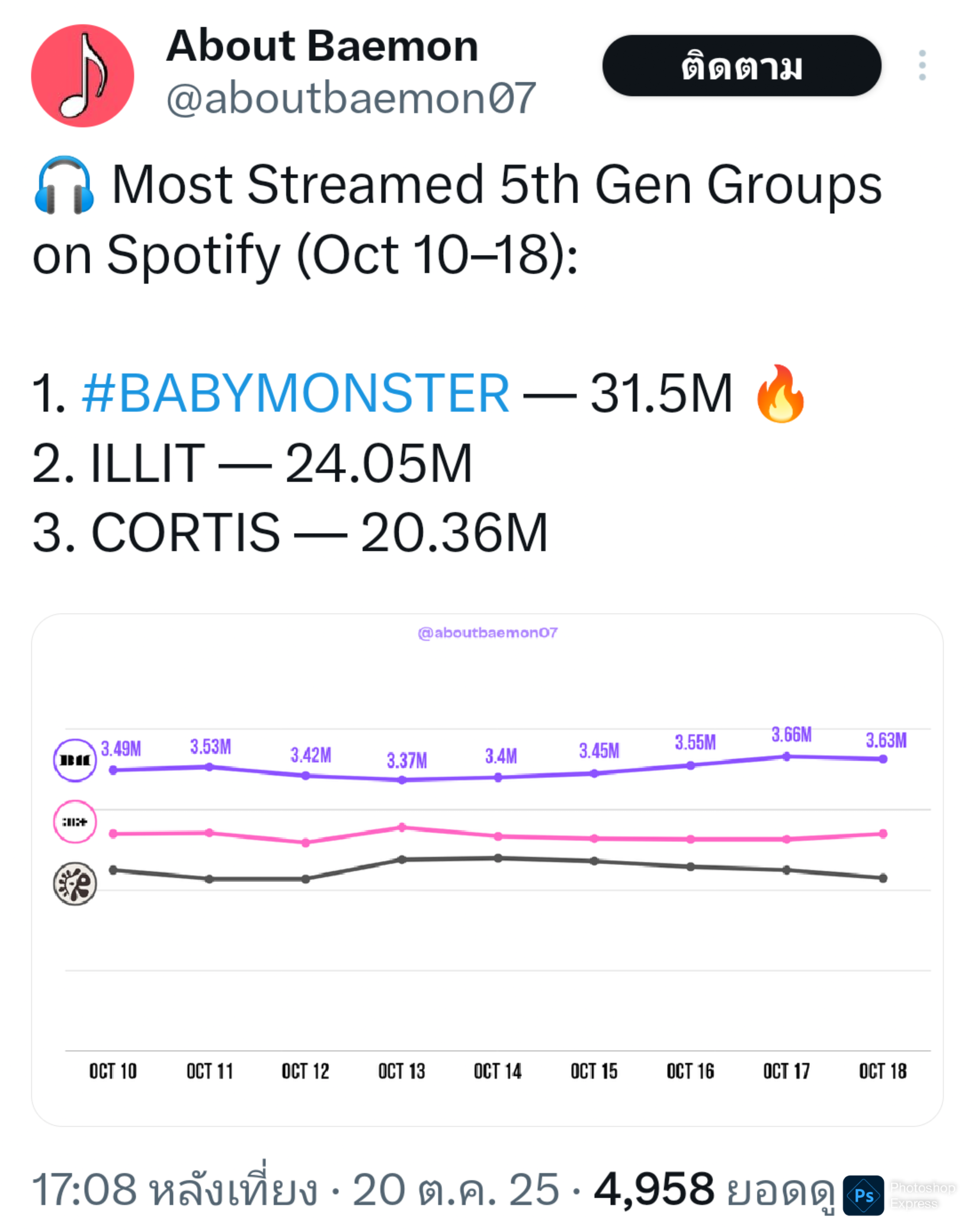 BABYMONSTER เป็นไอดอลเคป๊อปเจน 5 รวมชายหญิงที่มียอดสตรีมบน Spotify สูงสุดในช่วงวันที่ 10-18 ตุลาคม 2025 นี้