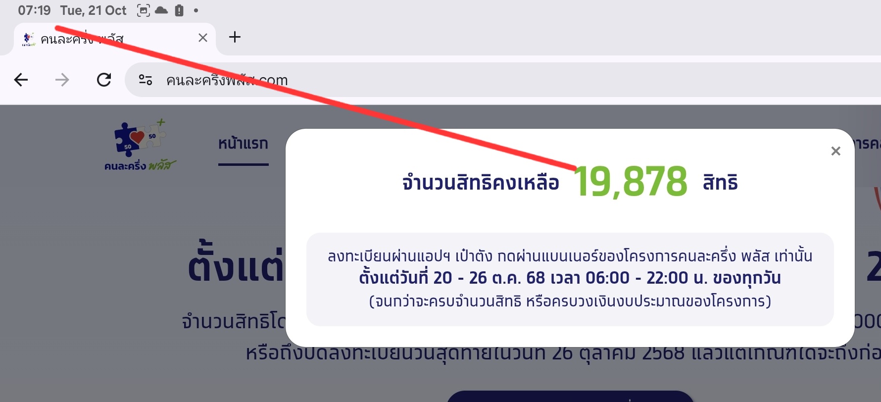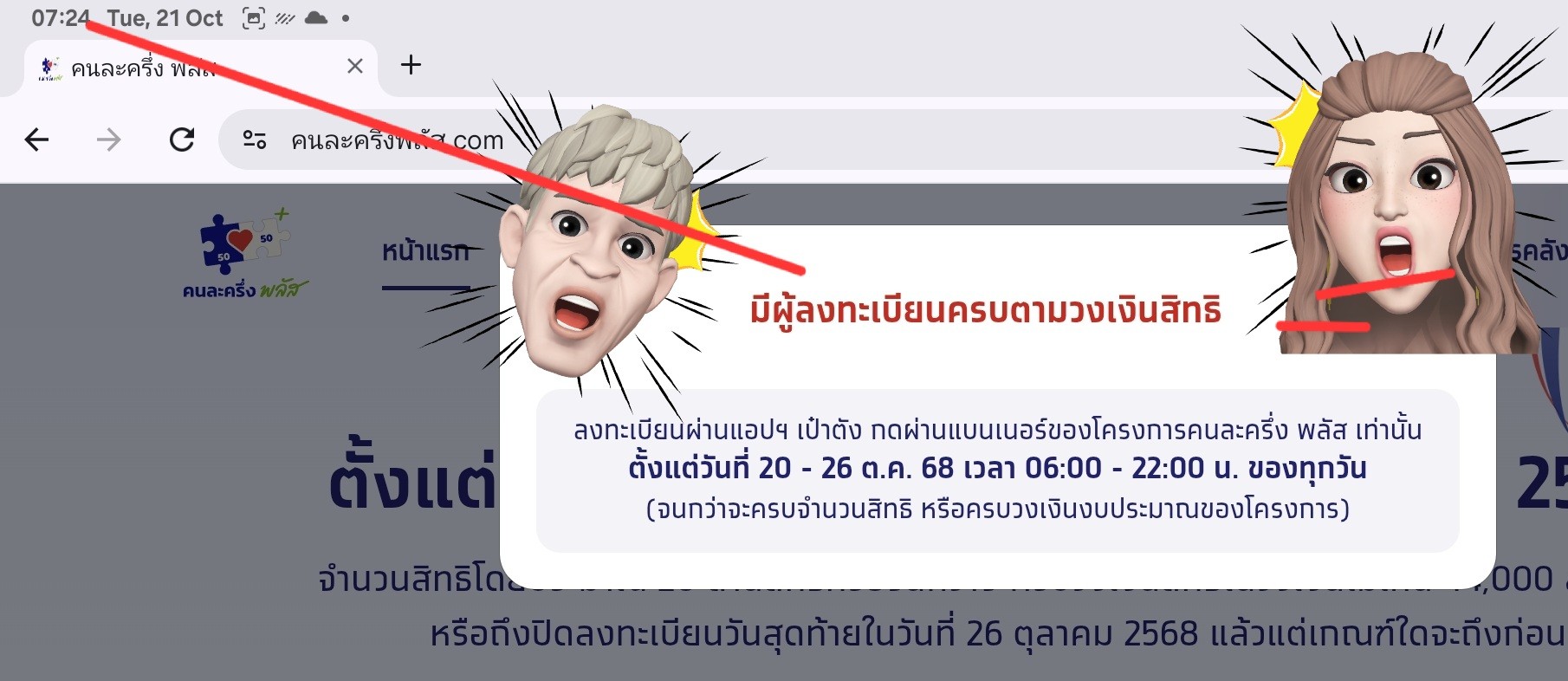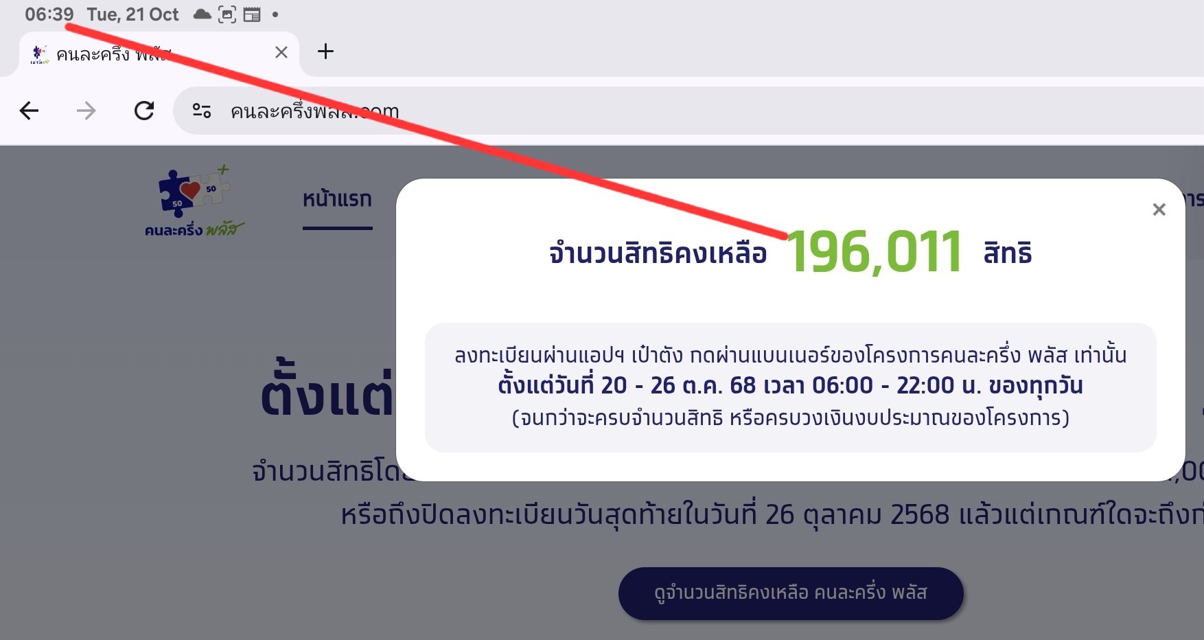 เว็บไซต์คนละครึ่งพลัส www.คนละครึ่งพลัส.com หลังเปิดให้ลงทะเบียนเพิ่ม 496,855 สิทธิ ล่าสุดสิทธิเต็มแล้ว วันที่ 21 ตุลาคม 2568 ผู้สื่อข่าวรายงานว่า เมื่อเวลา 06.00 น. รัฐบาลเปิดให้ประชาชนกดร