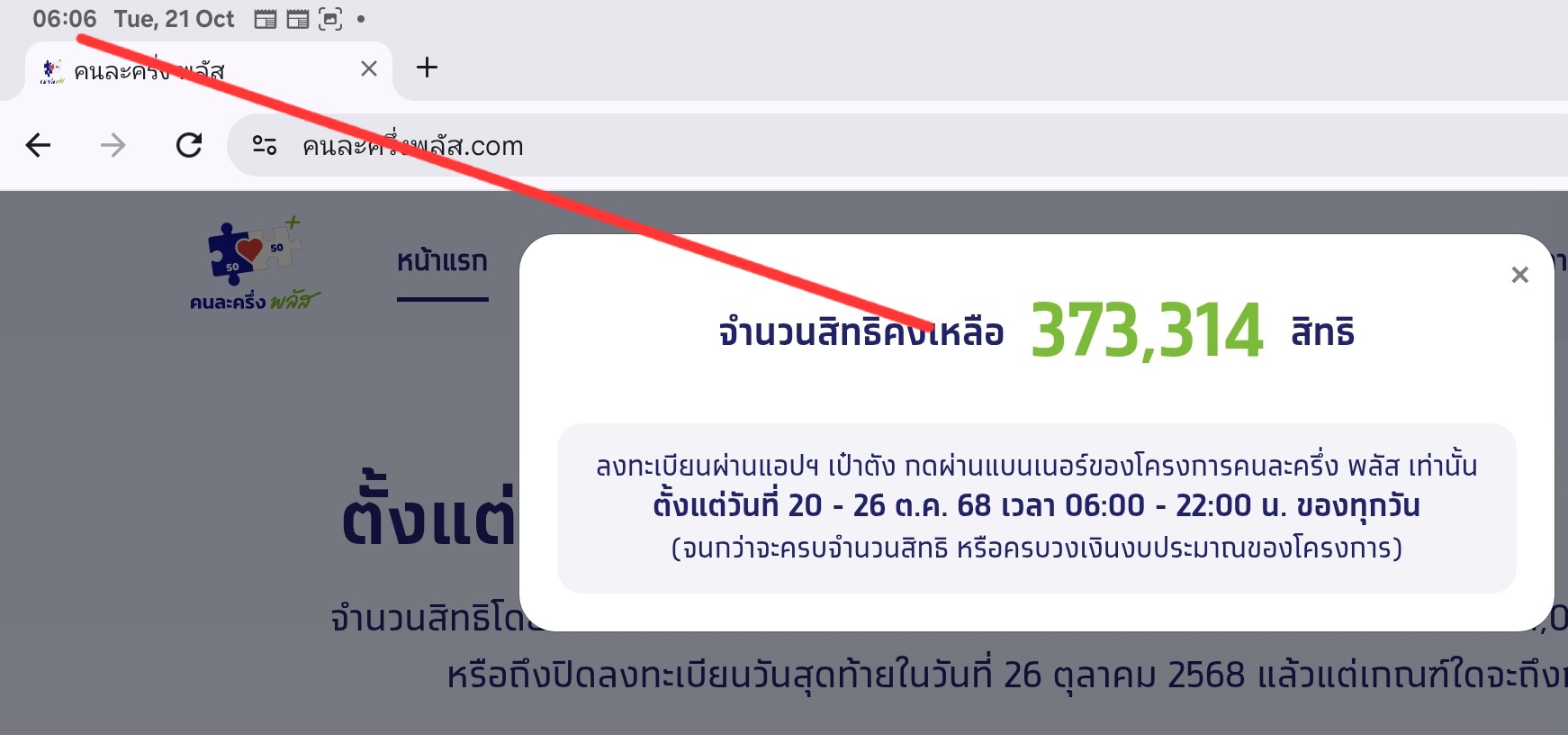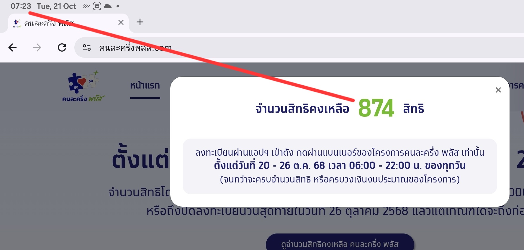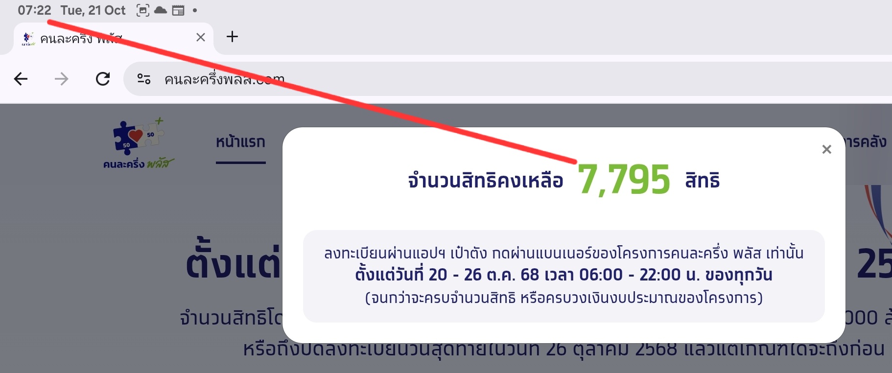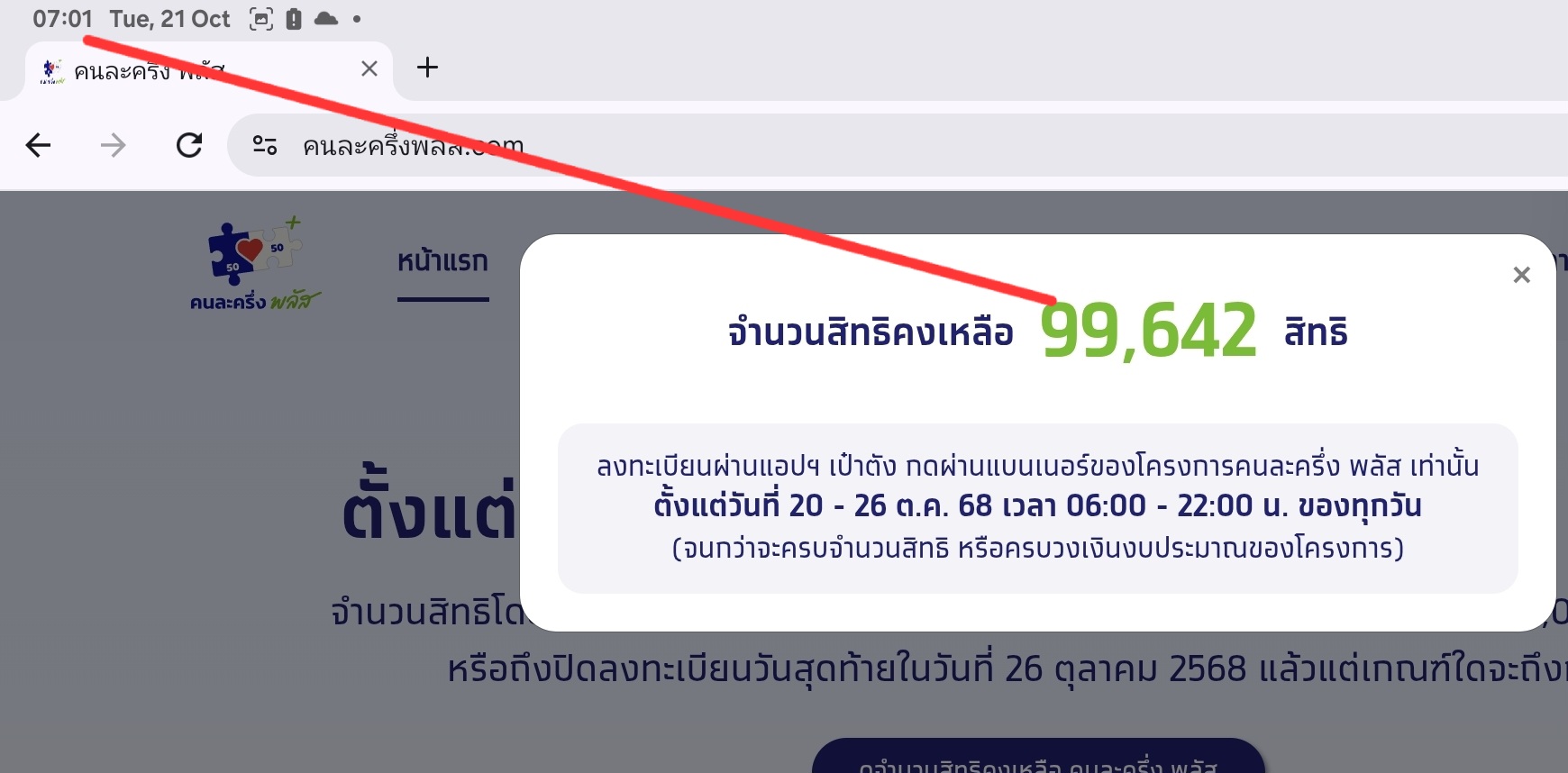 เว็บไซต์คนละครึ่งพลัส www.คนละครึ่งพลัส.com หลังเปิดให้ลงทะเบียนเพิ่ม 496,855 สิทธิ ล่าสุดสิทธิเต็มแล้ว วันที่ 21 ตุลาคม 2568 ผู้สื่อข่าวรายงานว่า เมื่อเวลา 06.00 น. รัฐบาลเปิดให้ประชาชนกดร