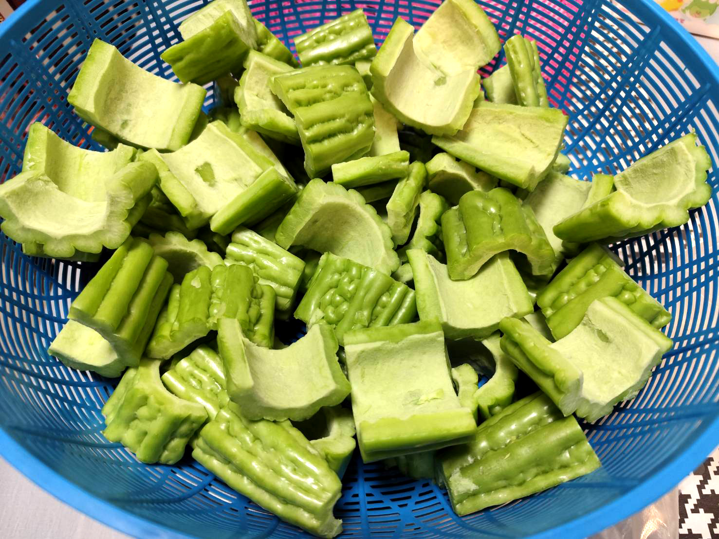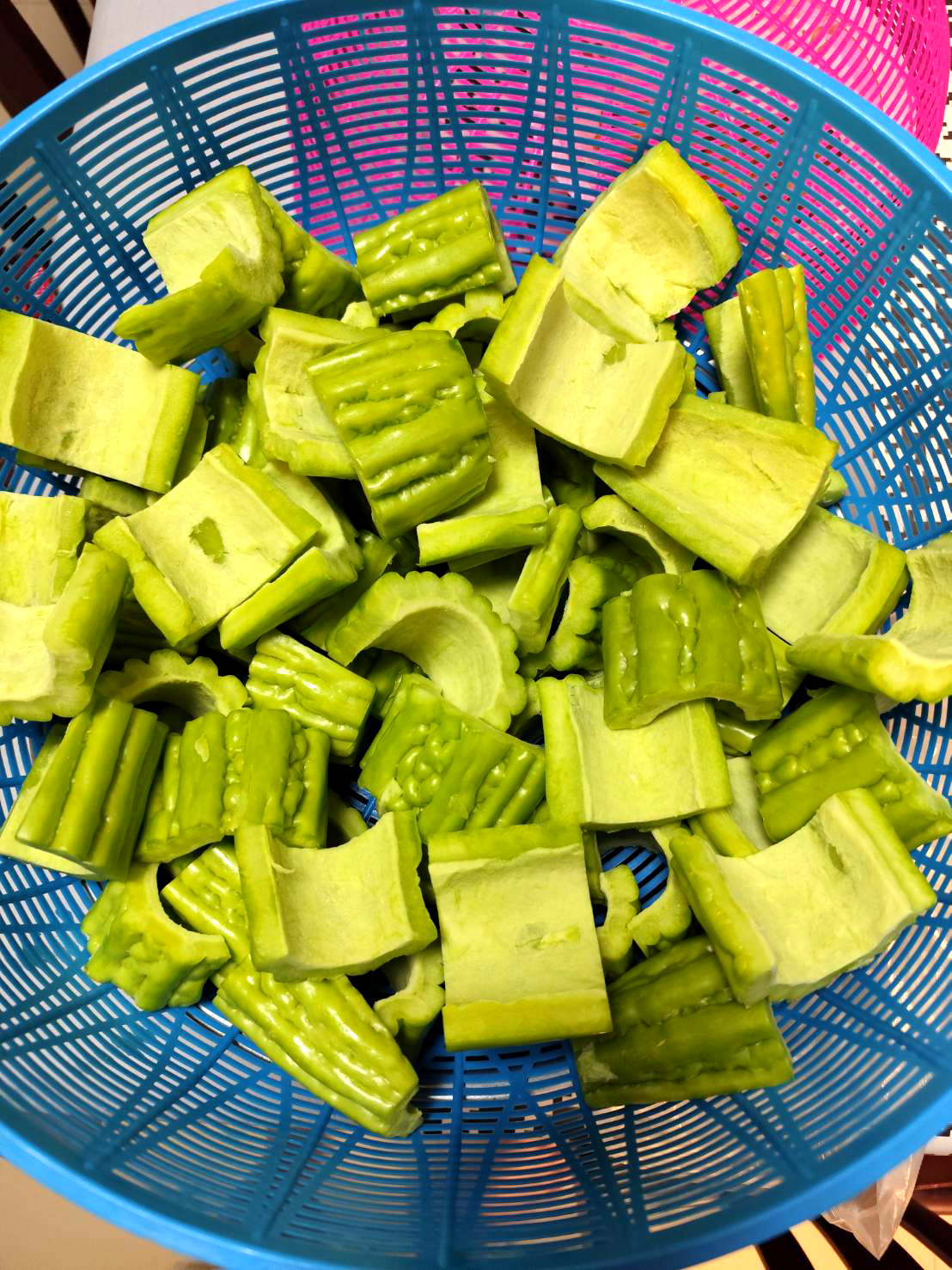 เตรียมมะระ เราใช้ทั้งหมด 4 ลูก เอามาหั่นและเอาเม็ดออก