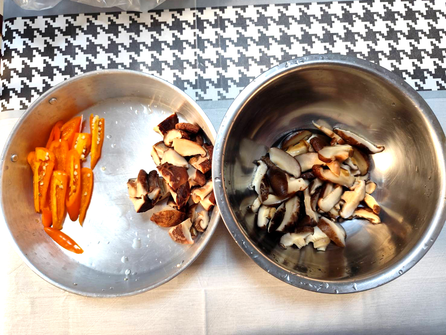 เห็ดหอม (เฮียโกว) แช่น้ำ และหั่นเป็นชิ้นๆ และพริกเหลืองหั่นเป็นชิ้น