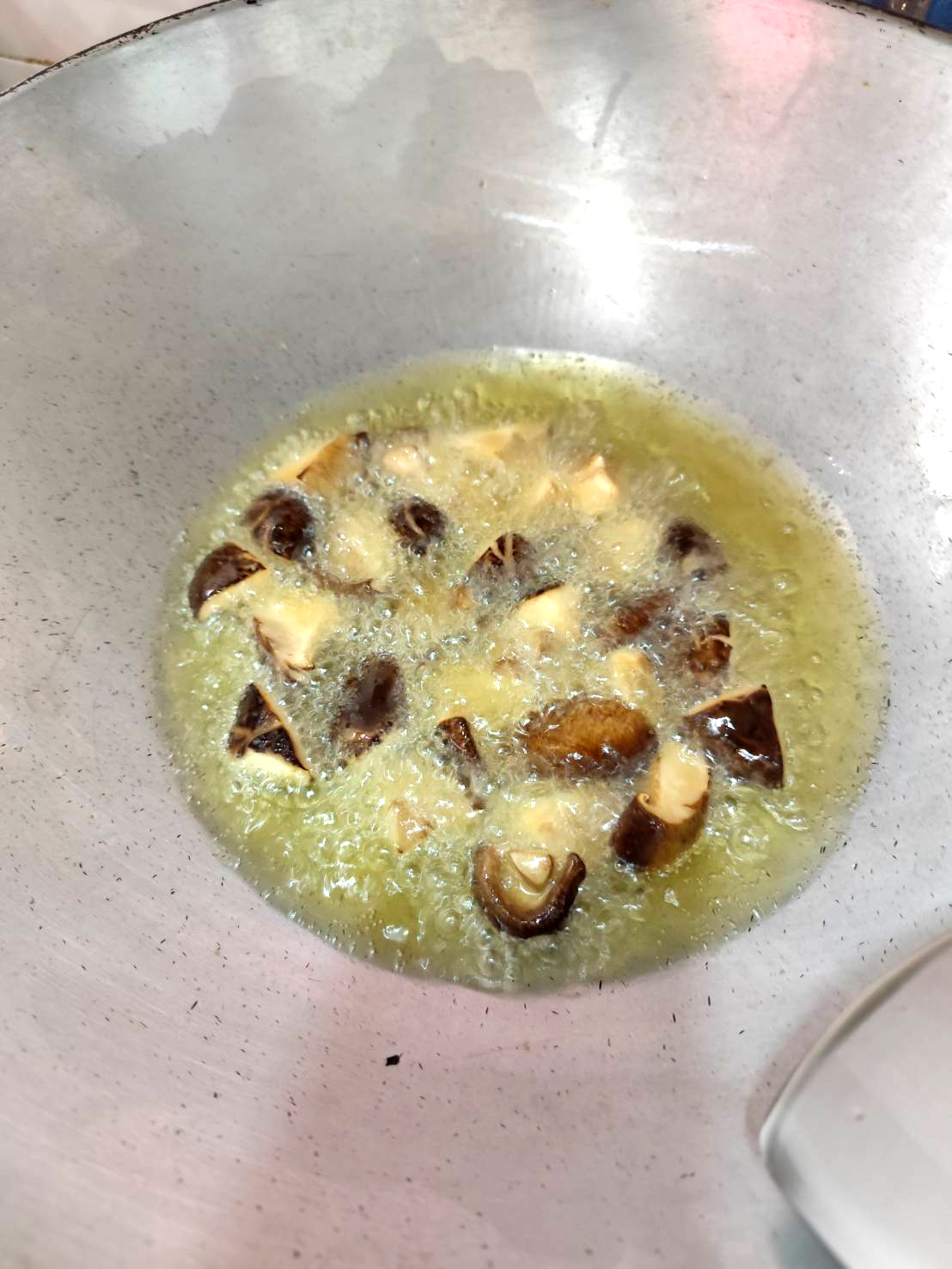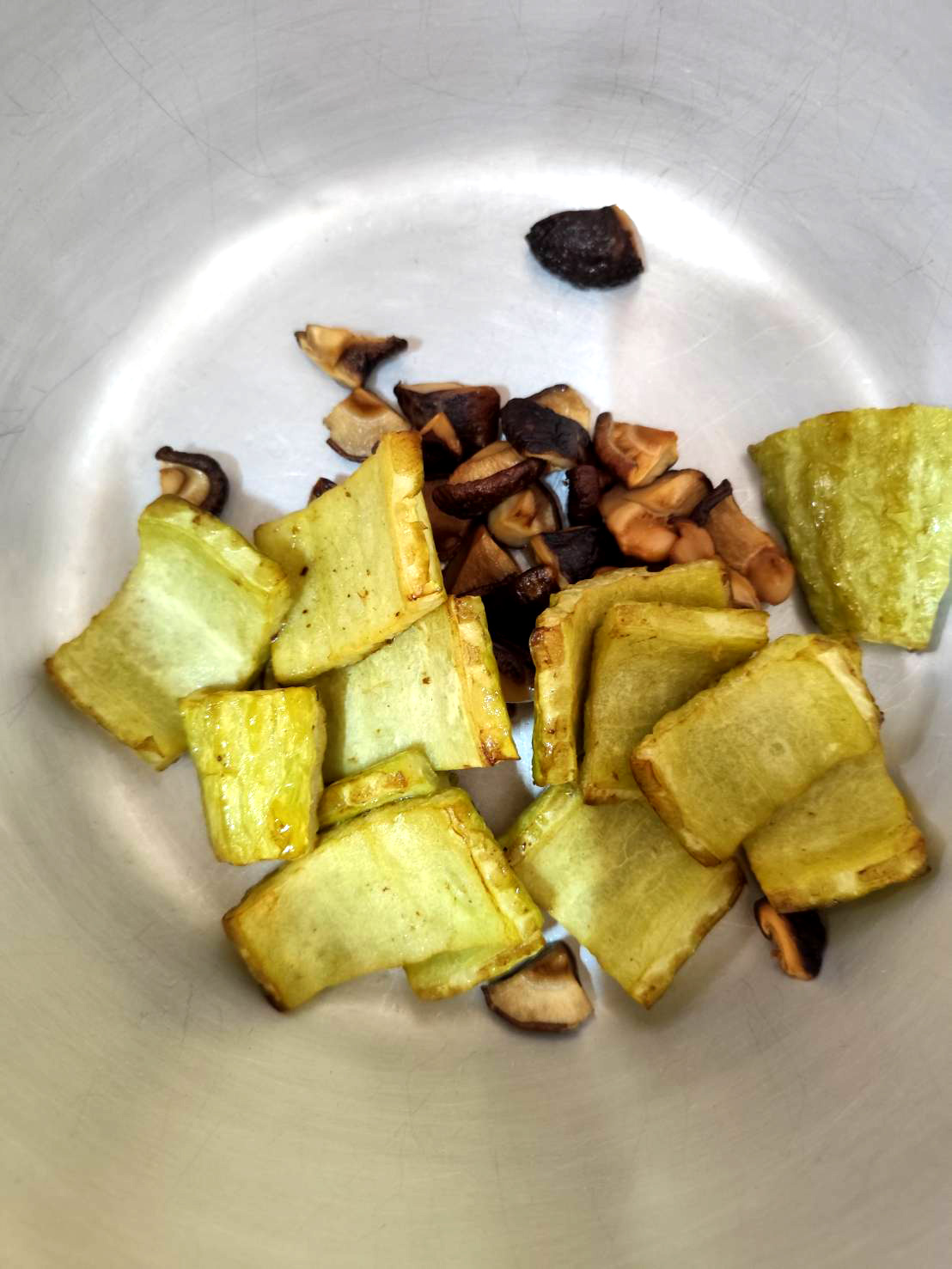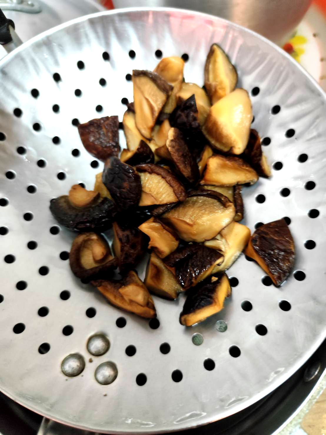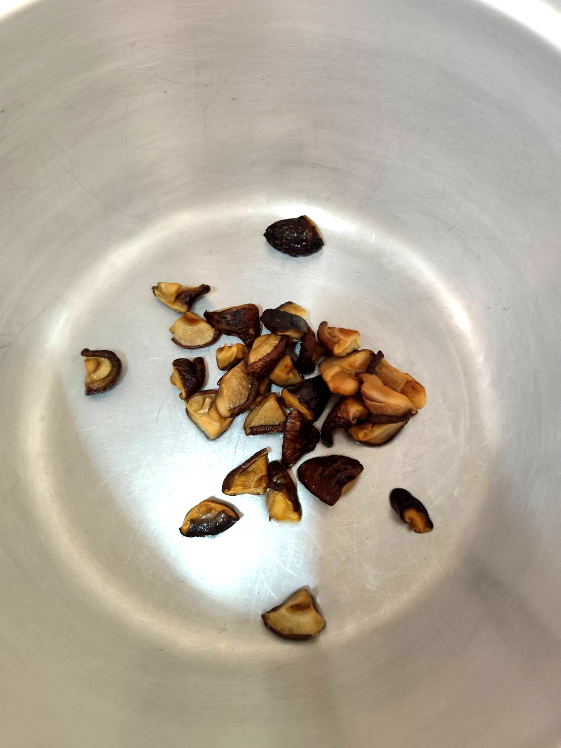 ขั้นตอนแรก เจียวเห็ดหอมให้หอม สีเหลืองเกรียม แล้วตักขึ้น และเอาใส่ในหม้อ