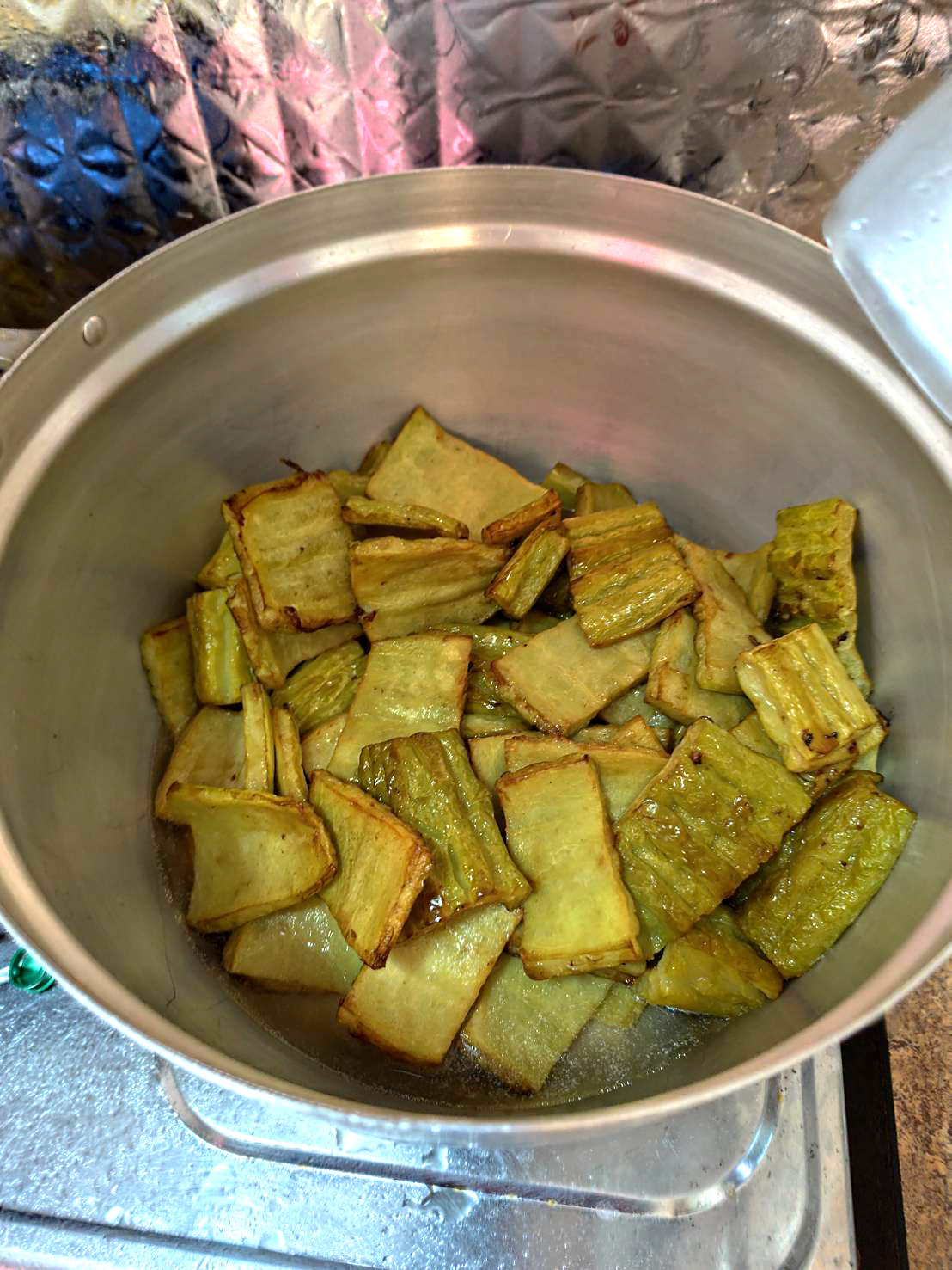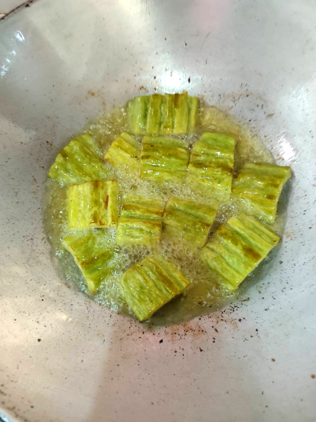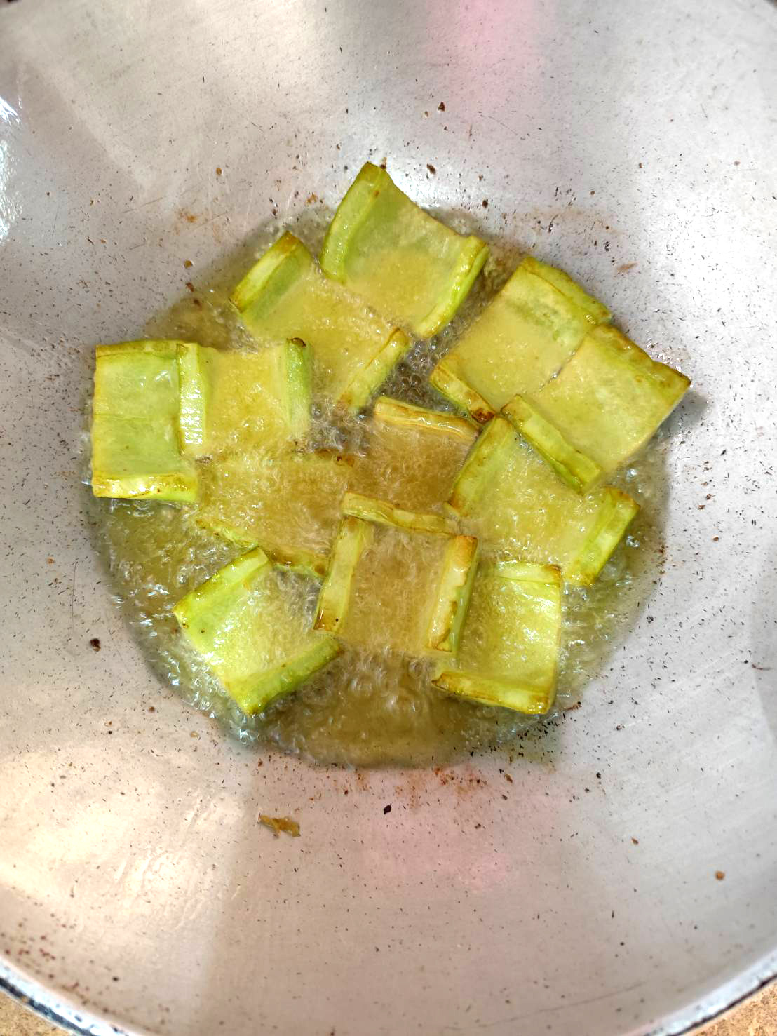 ทอดมะระให้สุก และสีเหลืองสวยงาม เราใช้น้ำมันเยอะๆ และใช้ไฟค่อนข้างแรงในการทอด