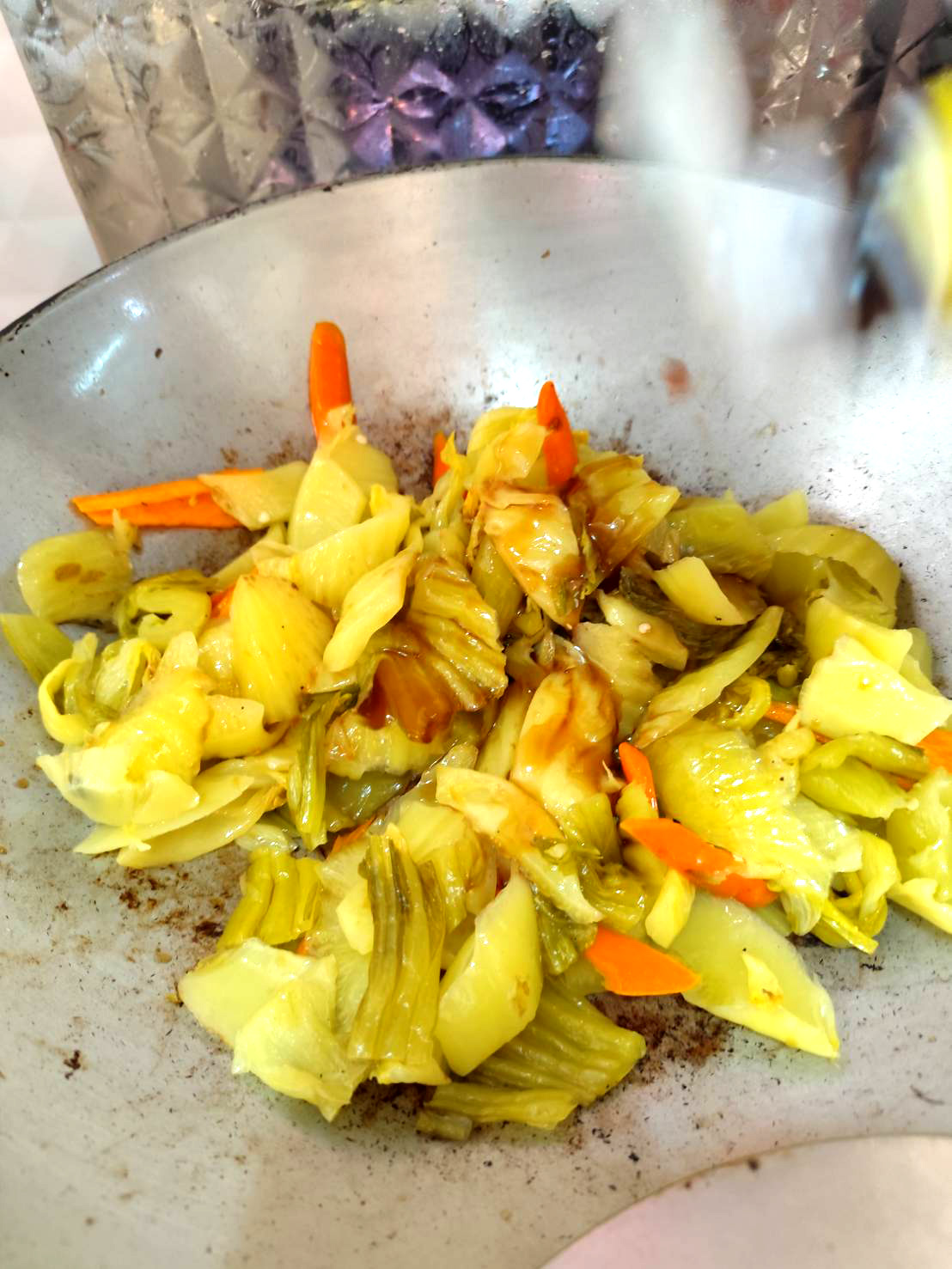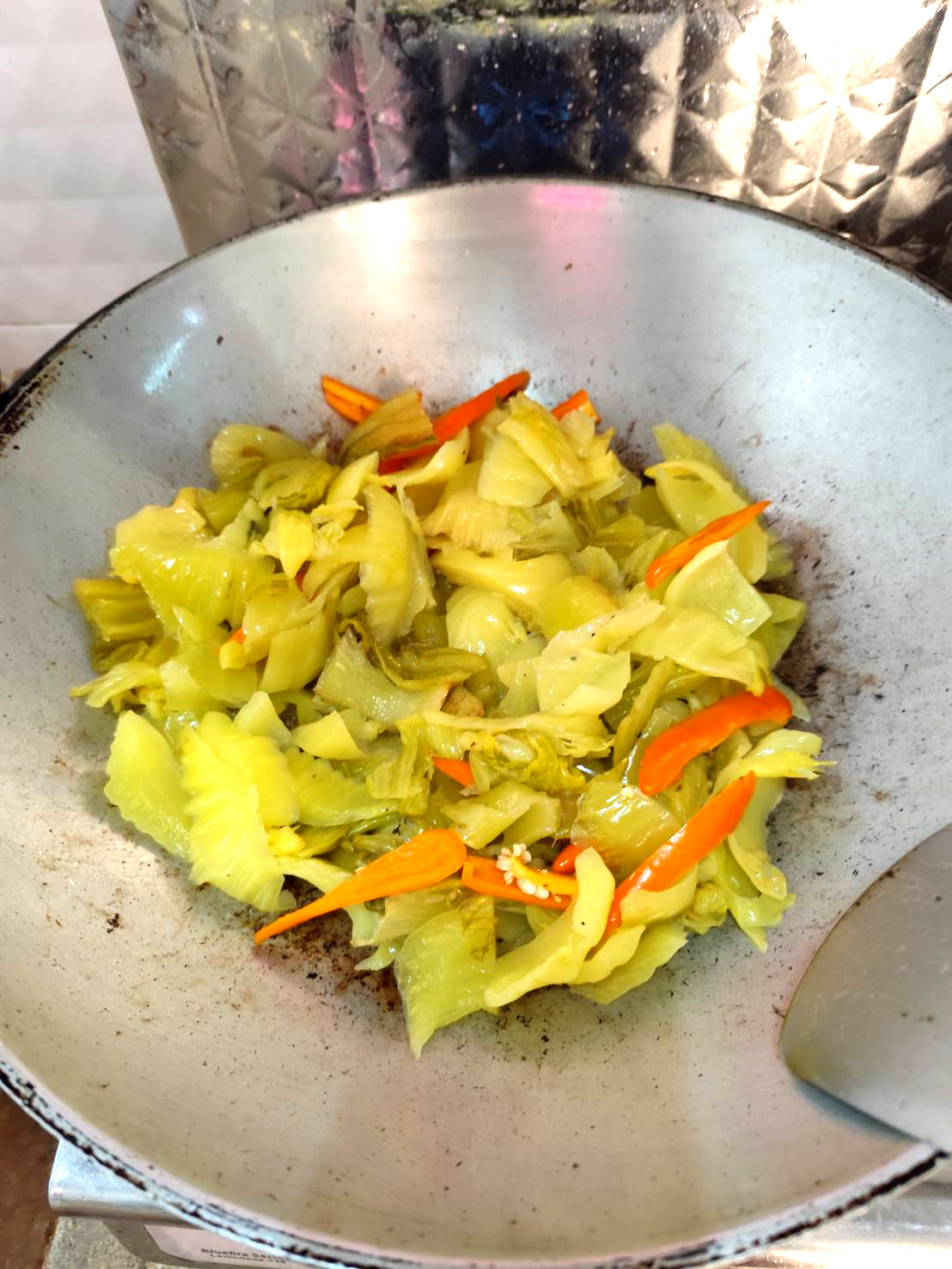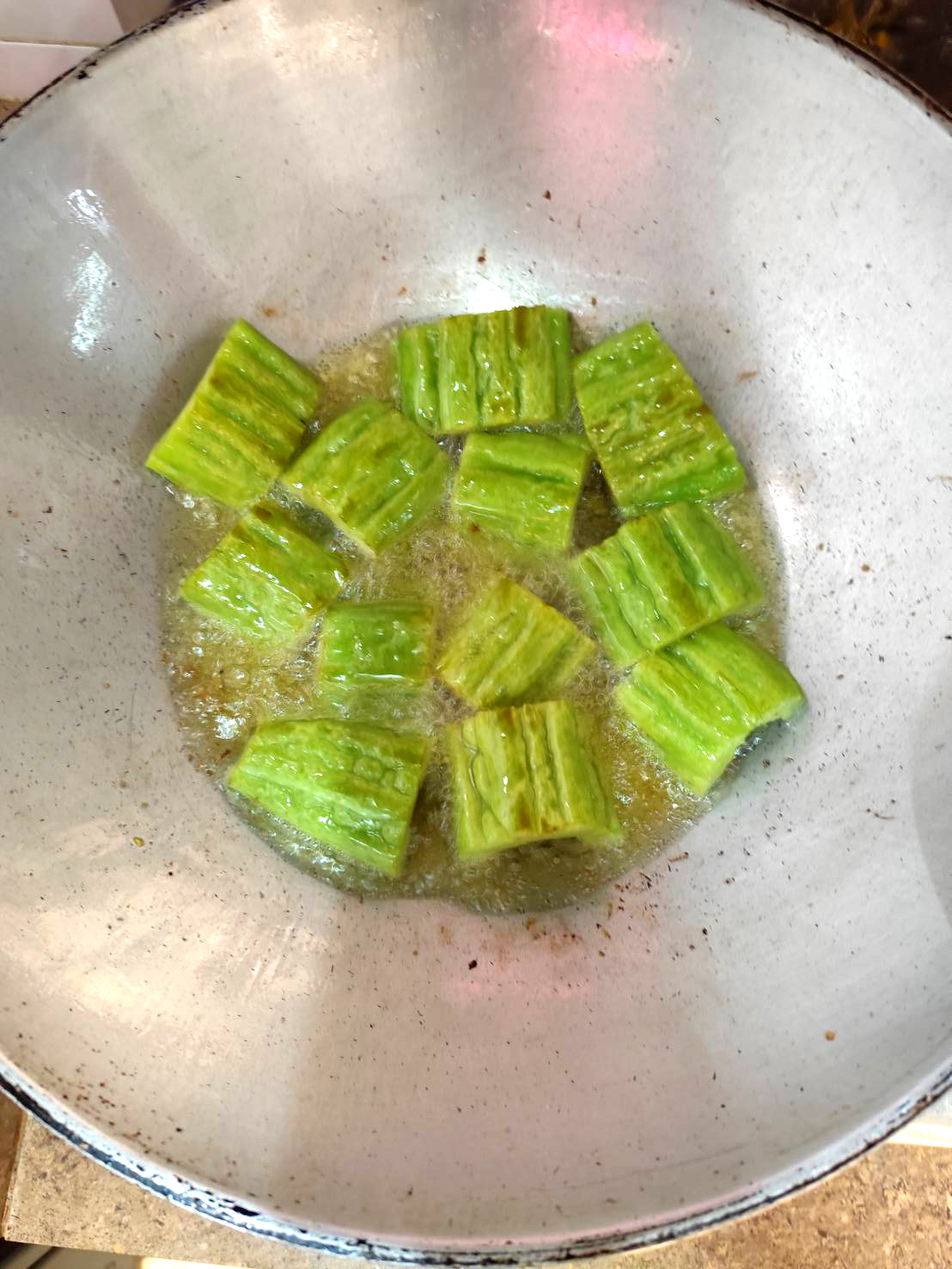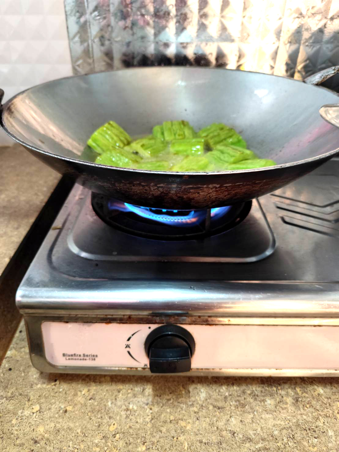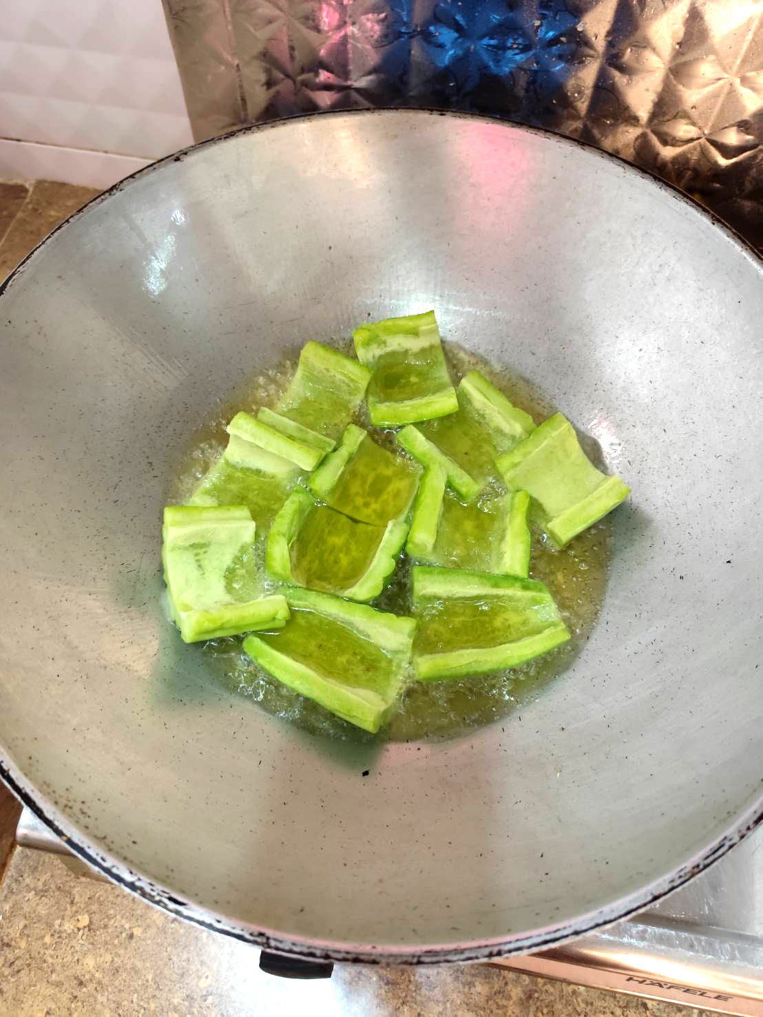 ทอดมะระจนหมด และตักน้ำมันออกให้เหลือแค่ก้นกระทะ แล้วใส่เกี่ยมฉ่ายและพริกเหลืองลงไปผัดต่อ