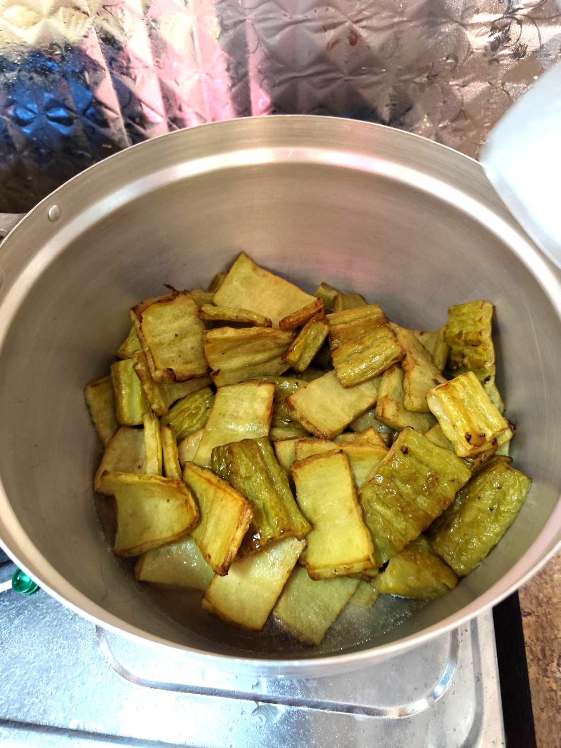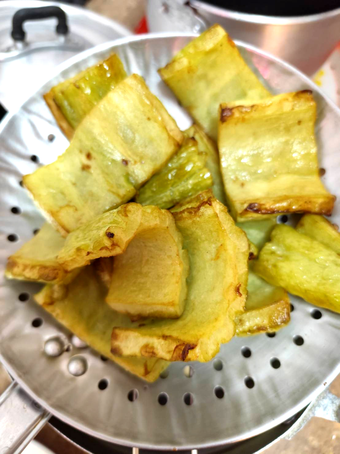 พอทอดเสร็จแล้วตักขึ้นให้สะเด็ดน้ำมัน และนำใส่ในหม้อที่เตรียมไว้