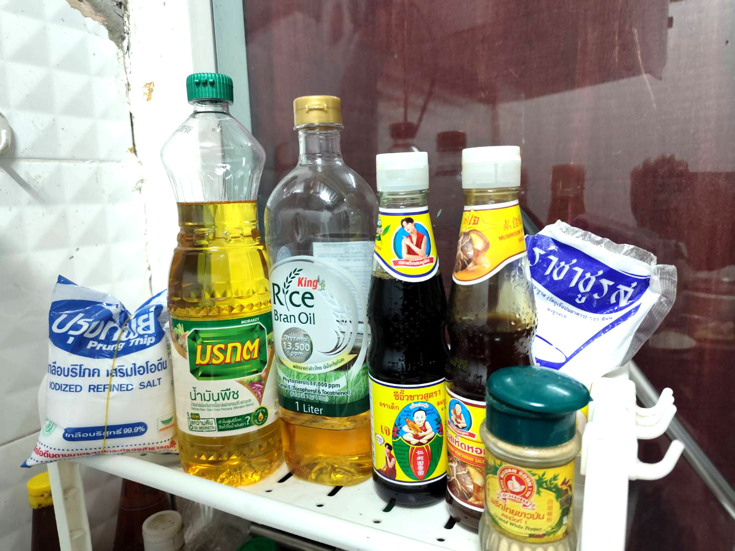 น้ำมัน, ซีอิ้วขาว, ซีอิ้วดำ, ซอสหอยนางรม, น้ำตาล, เกลือ, ผงชูรสเจ และพริกไทย
