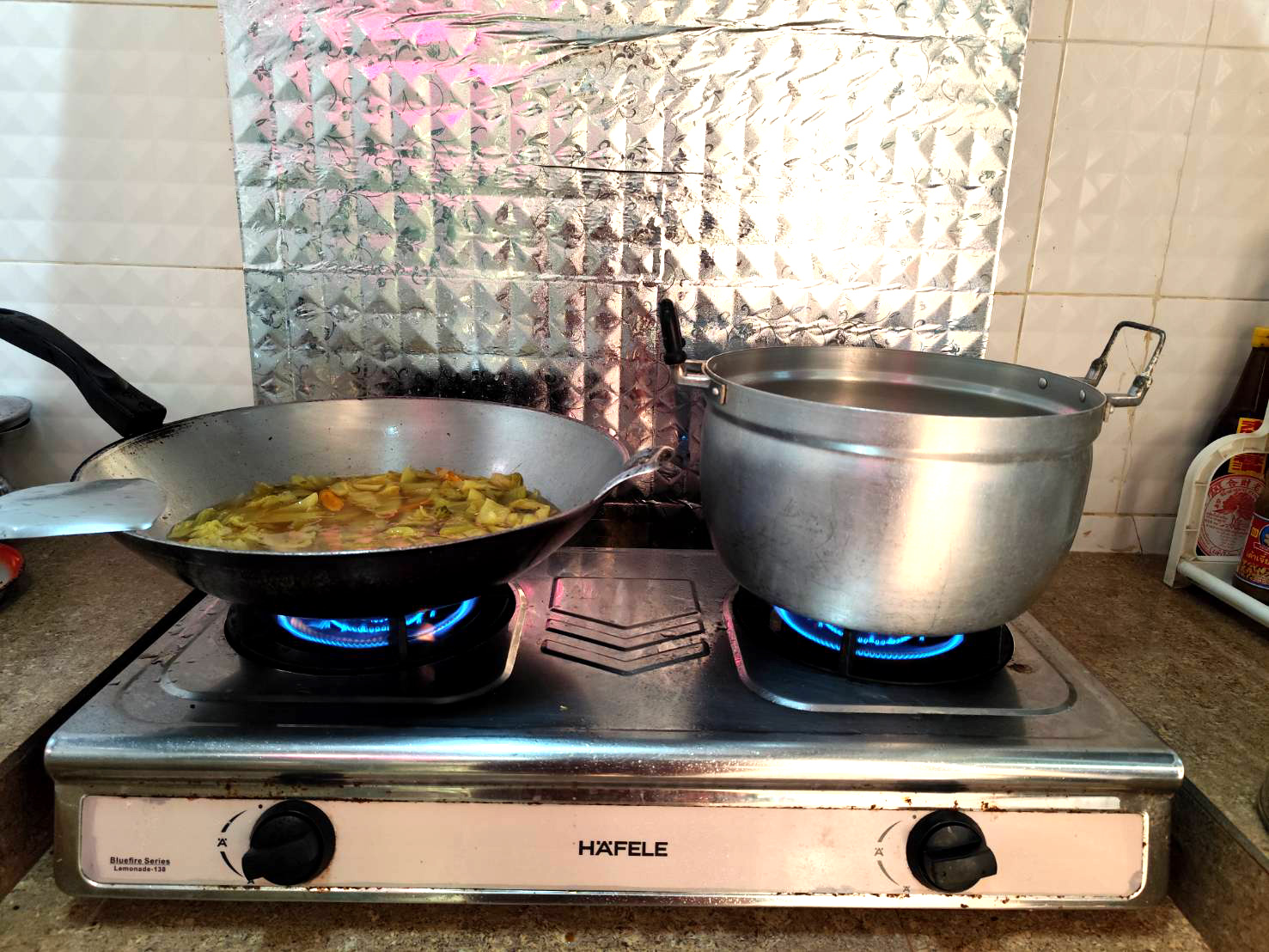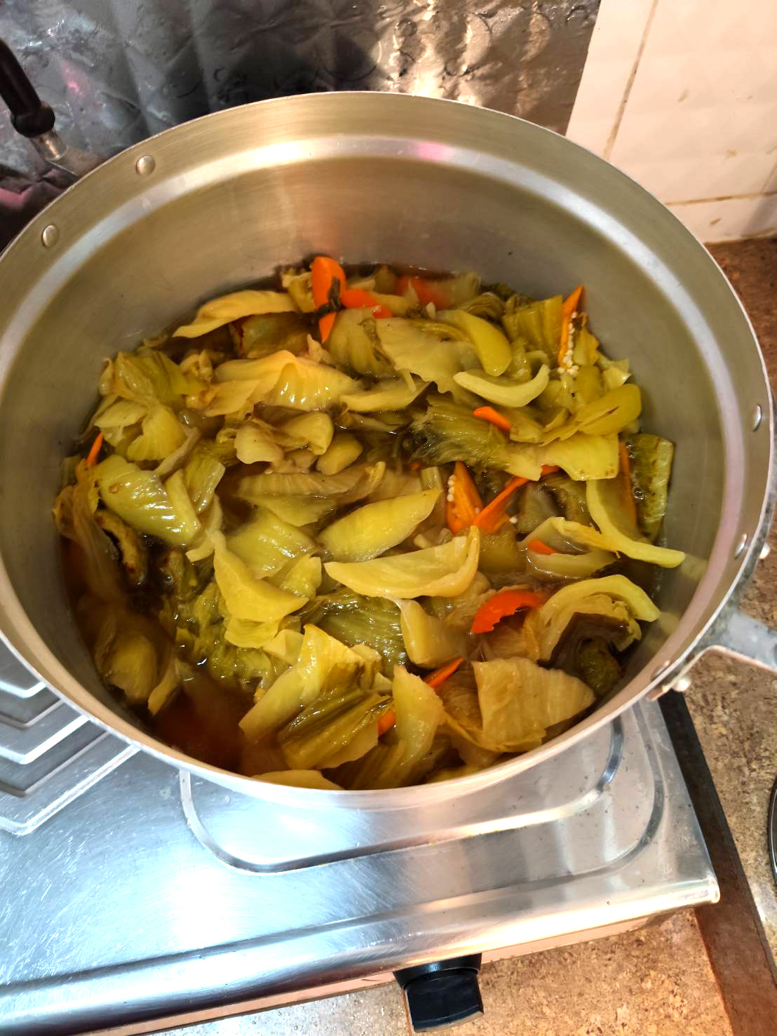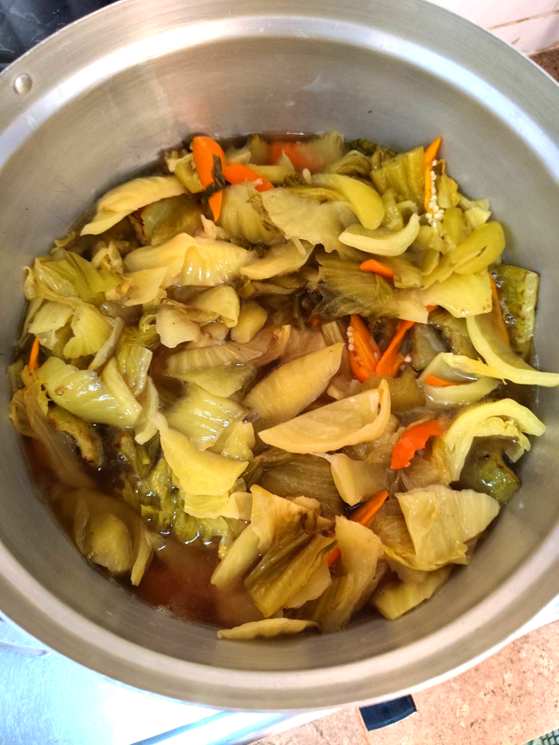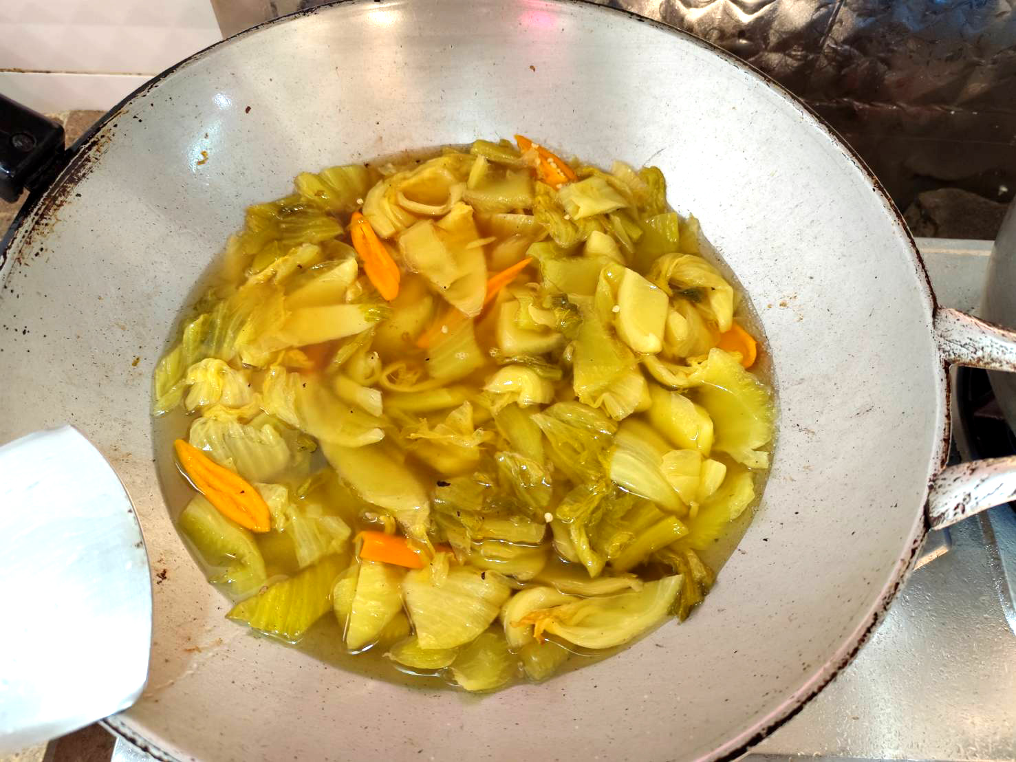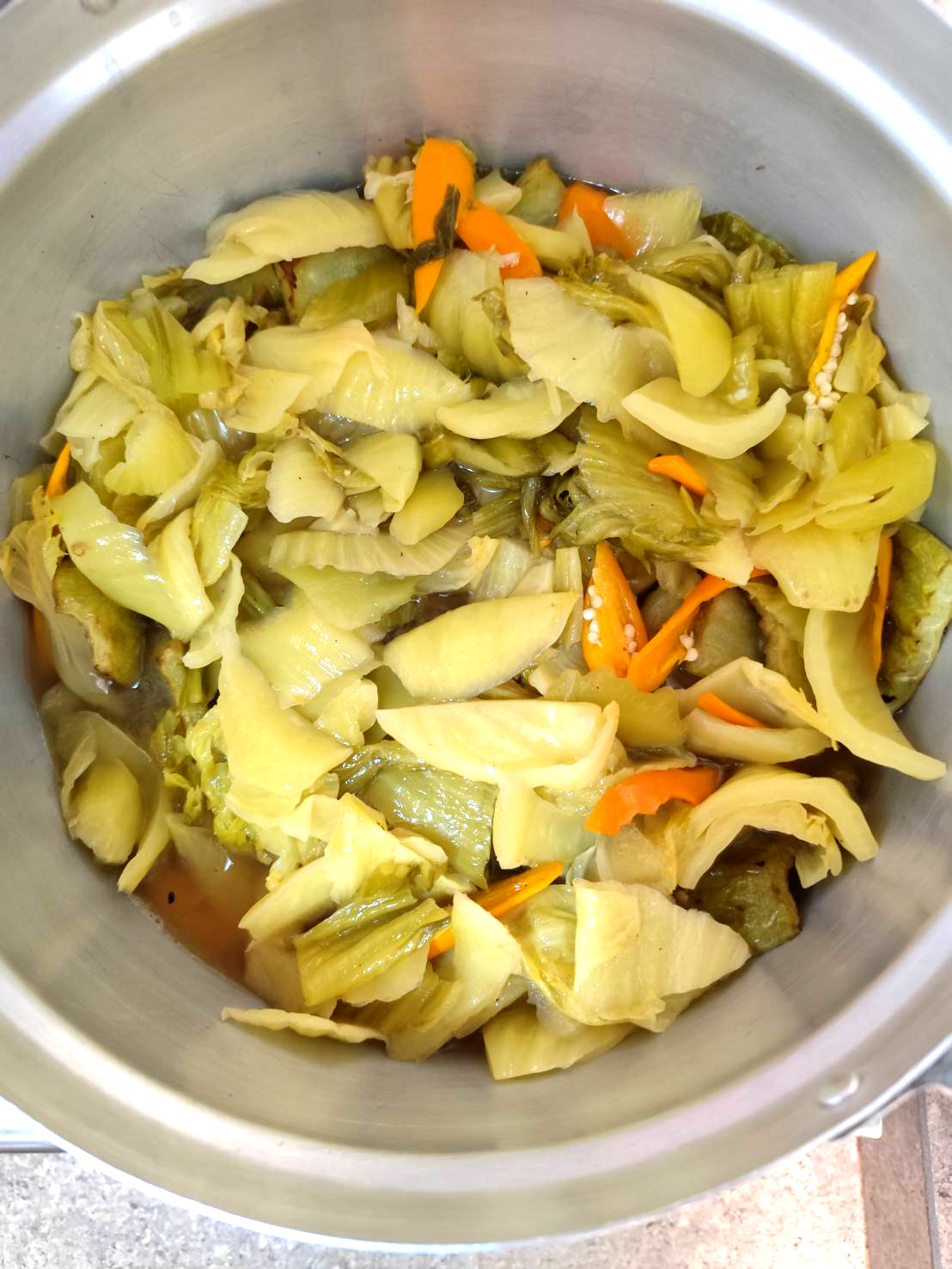 ส่วนหม้อใหญ่ ระหว่างที่ทำเกี่ยมฉ่าย ก็จะใส่น้ำลงไปต้มเหมือนกัน