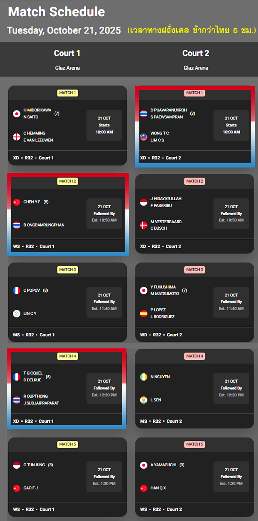 • โปรแกรม/ผลการแข่งขันของนักกีฬาไทย : รอบ 32 คน [Day 1] (21 ต.ค. 68) (คู่แรก 15.00 น.)