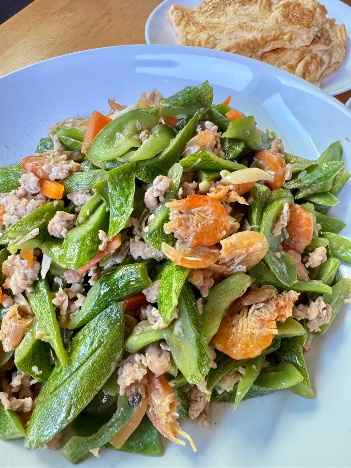 บวบงูปกติเค้าต้มกินกับน้ำพริก เราได้มาสองกำ10บาท เอามาหั่นผัดกับหมูสับ ใส่กุ้งแห้งนิด ได้เยอะดี กินกับ ไข่ขี้เกียจ พอแล้วสำหรับมื้อเช้า เพราะยังอยู่ในช่วงฮีลใจ