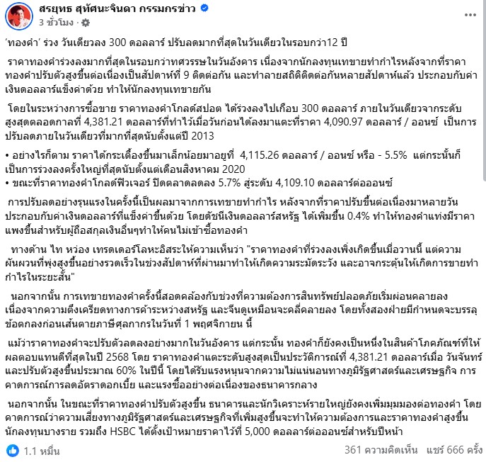 ราคาทองคำตลาดโลกร่วงหนักพรวดเดียวเป็นประวัติการณ์ โดยทองคำฟิวเจอร์เมื่อคืนที่ผ่านมาร่วงหนักพรวดเดียว 250 ดอลลาร์ หรือคิดเป็น 5.74% สู่บริเวณ 4,109.10 ดอลลาร์ต่อออนซ์ ส่วนราคาทองคำ Spot ร่วงหนักจากเมื่อวานที่ระดับกว่า 4,200 ดอลลาร์ต่อออนซ์ สู่บริเวณแถวๆ 4,080 ดอลลาร์ต่อออนซ์ในเช้าวันนี้