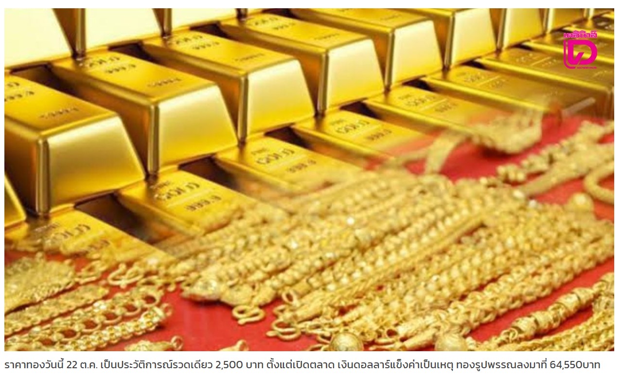 ราคาทองวันนี้ 22 ต.ค. เป็นประวัติการณ์รวดเดียว 2,500 บาท ตั้งแต่เปิดตลาด เงินดอลลาร์แข็งค่าเป็นเหตุ ทองรูปพรรณลงมาที่ 64,550บาท