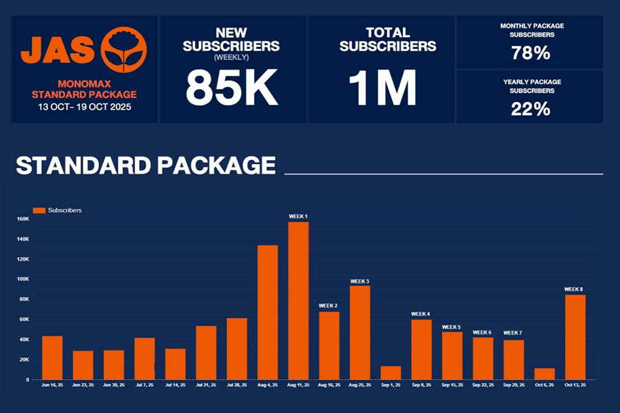 การเติบโตของยอดสมาชิก Monomax ที่พุ่งทะยานอย่างต่อเนื่อง จะทำให้ JAS และ MONO ก้าวขึ้นเป็นผู้นำธุรกิจคอนเทนต์กีฬาและสตรีมมิ่งพรีเมียมของไทยและภูมิภาคในทศวรรษใหม่อย่างแท้จริง