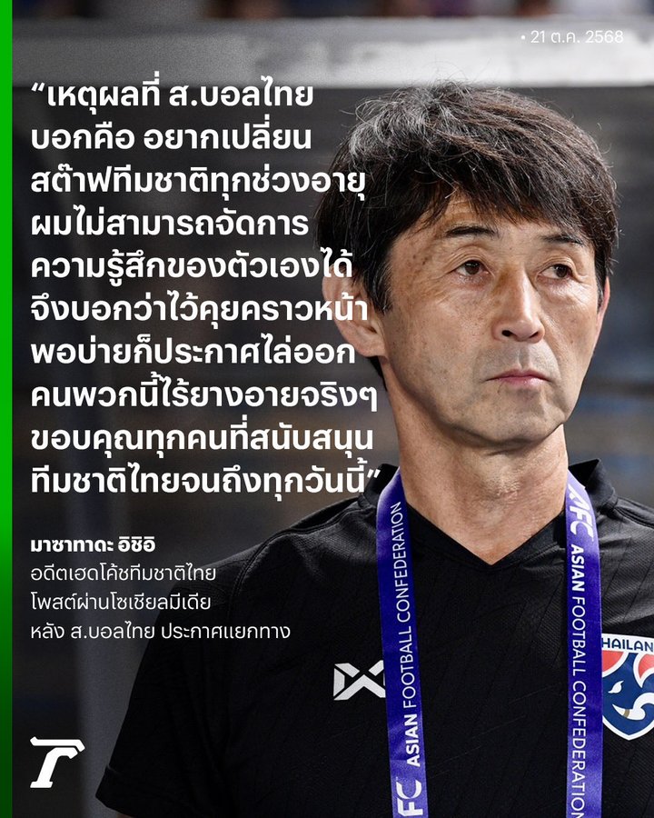 สื่อในญี่ปุ่นรายงานข่าวคึกโครมการปลดโค้ชซามูไรคนสุดท้ายของทีมพี่ใหญ่เบอร์ 1 แห่งอาเซี่ยน โค้ชที่จบฟีฟ่าแรงกิ้งอันดับ 96 ของโลก เป็น 15 ทีมที่ดีที่สุดในเอเชียเดือนตุลาคม 2025 การมาของโค้ชคนใหม่ทีมช้า