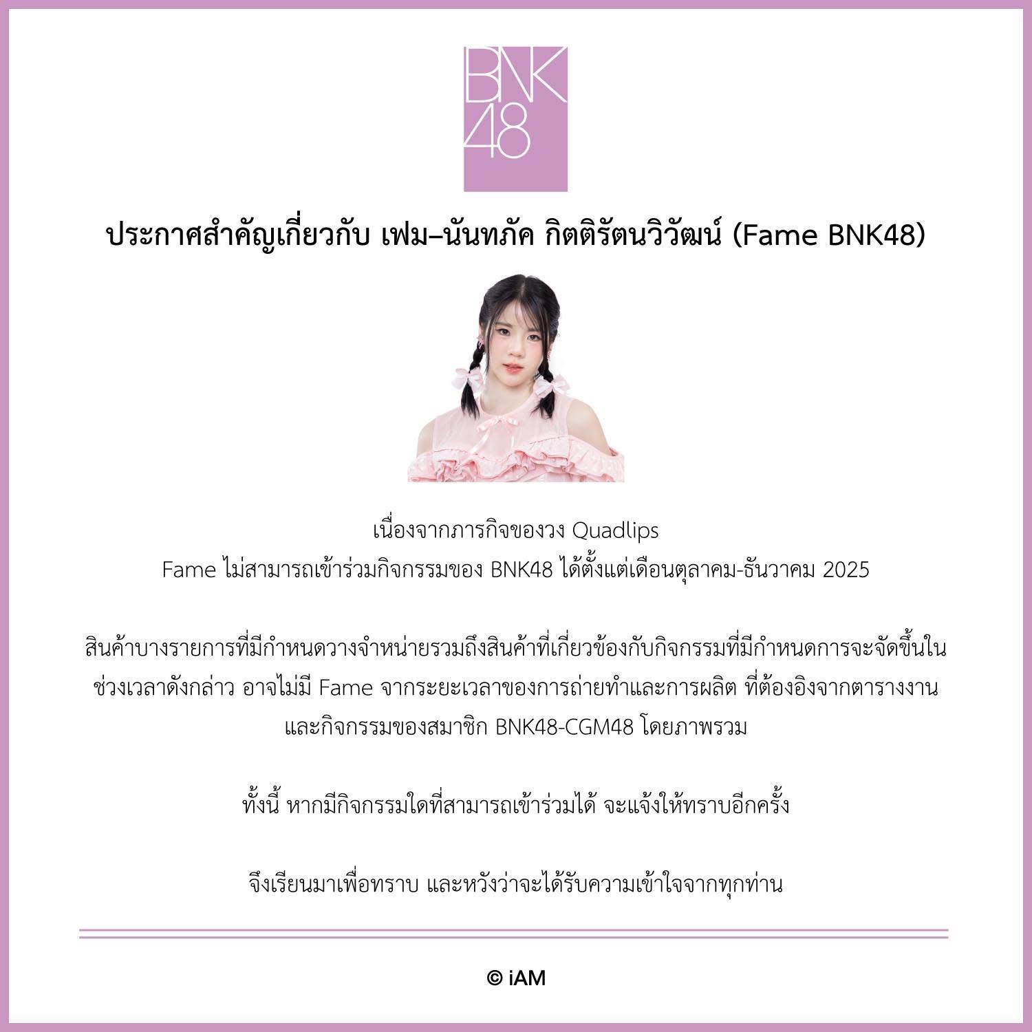ประกาศ “เฟม BNK48” ไม่สามารถเข้าร่วมกิจกรรมของวงได้จนถึงสิ้นปีนี้