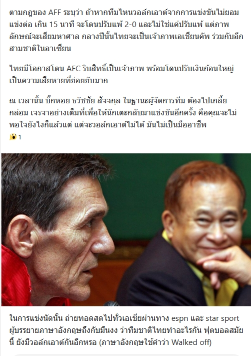 สำหรับความรู้สึกของชาติอาเซียนที่มีต่อฟุตบอลไทย ส่วนใหญ่แล้วจะเป็นความชื่นชมในทักษะความสามารถ เพราะเราเป็นชาติที่ได้แชมป์อาเซียนมากที่สุด นอกจากนั้นยังส่งออกนักเตะไปค้าแข้งในเจลีก อย่างต่อเนื่อง แต่มีอยู่ 2 ครั้ง ที่เราทำให้ชาติในอาเซียนด้วยกันรู้สึกผิดหวัง ครั้งแรก คือศึกไทเกอร์คัพ ในปี 1998 ที่เราแย่งกันแพ้กับอินโดนีเซีย คือแม้ไทยจะไม่ใช่คนเตะเข้าประตูตัวเอง แต่พฤติกรรมไม่อยากชนะของเรา มันก็น่าอับอายเอามากๆ ส่วนครั้งที่สอง เกิดขึ้นในปี 2007 ในศึก AFF เช่นกัน เมื่อเราตั้งใจทำการ "วอล์กเอาต์" เพราะกรรมการตัดสินไม่ถูกใจ คือเดินออกจากสนามไปเลยไม่ยอมเล่นต่อ ท่ามกลางความงุนงงของคนดูทั้งสนาม และทางโทรทัศน์ ผมเคยเขียนเหตุการณ์แย่งกันยิงในปี 1998 มาแล้วนะครับ คราวนี้อยากย้อนเล่าเหตุการณ์วอล์กเอาต์ในปี 2007 บ้าง ศึก AFF ในปีนั้น เบียร์ไทเกอร์หมดสัญญาพอดี ทำให้ปรับจากชื่อ Tiger Cup ไปใช้ชื่อ AFF Championship และนั่นเป็นครั้งเดียวของรายการชิงแชมป์อาเซียน ที่ไม่มีเมน สปอนเซอร์ เพราะในการแข่งครั้งต่อมา จะได้ Suzuki มาเป็นสปอนเซอร์ ตามด้วย Mitsubishi Electric ในปัจจุบัน เฮดโค้ชของทีมชาติไทยชุดนั้น คือ