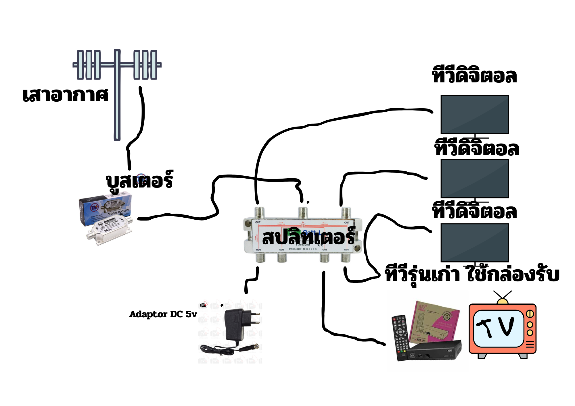 ผมจะเดินสายอากาศ ดิจิตอลทีวี 4 จุดรับชม ระยะทางจากสถานีส่ง 37.1 กม. ใช้เสาขนาด 14E ไทยแซท ต่อเข้าบูสเตอร์ ไทยแซท แล้วขจะต่อเข้าสปลิตเตอร์ 1x6 และจะจ่ายไฟเข้าบูสเตอร์ ทำแบบนี้ ถูกต้องไหมครับ ขอผู้เชี่ยวชาญหรือเป็นช่างมาตรฐานมาตอบหน่อยครับ ว่ามีอะไรผิดไหมหรือถูกต้องแล้ว