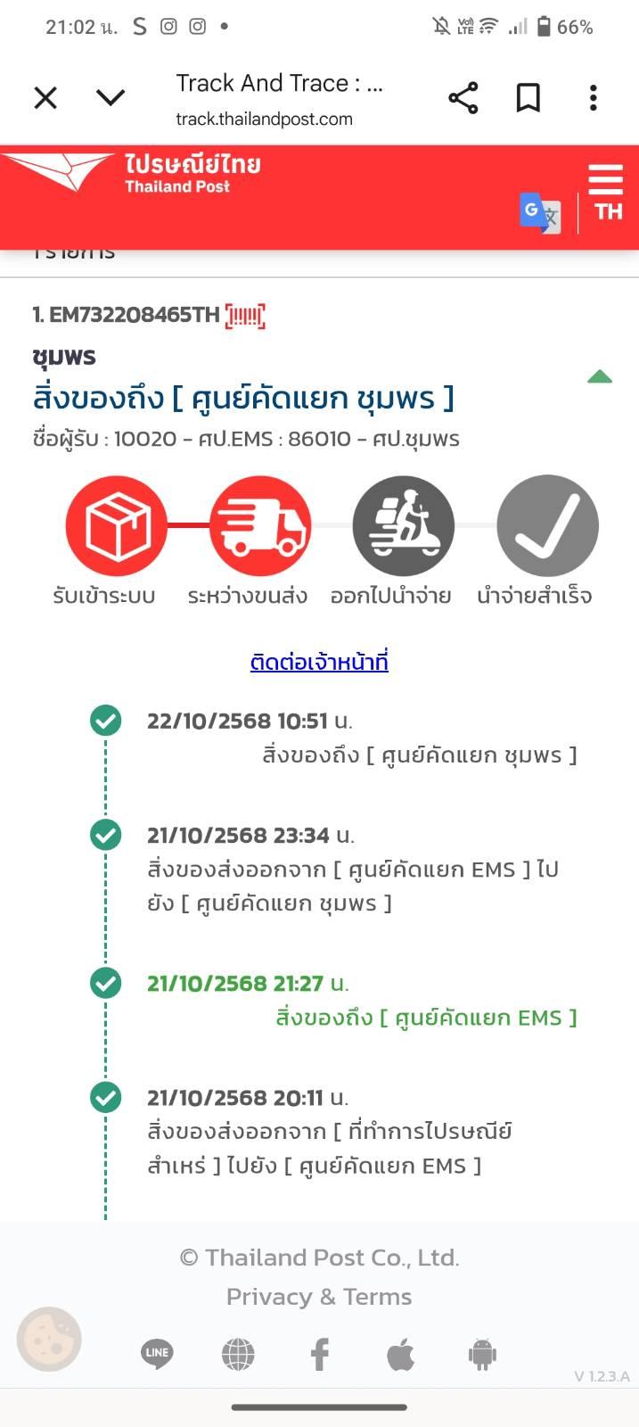 พอดีสั่งของไป ร้านส่งems อยากทราบว่าของจะมาถึงเมื่อไหร่คะ ค้างอยู่ที่ศป.ชุมพรวันนึงแล้วค่ะ