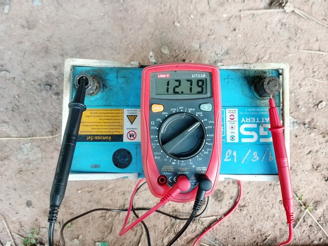 สภาพแบตเตอรีที่ใช้งานมา 4 ปี 7 เดือน ยังดูดีไฟยังแรง รูปนี้วัดด้วยมัลติมิเตอร์ย่านวัดแรงดัน DC ปกติ ได้แรงดัน 12.79V