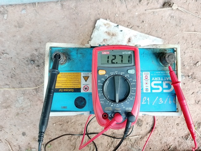รูปนี้วัดด้วยฟังชั่นวัดแบตเตอรี่ของมัลติมิเตอร์ได้ 12.71V การวัดด้วยฟังชั่นนี้จะแม่นยำชื่อถือได้มากกว่าเพราะฟังชั่นนี้ใช้ตัวต้านทานให้กระแสไฟฟ้าไหลแล้วค่อยวัดแรงดันจึงได้ค่าที่ต่ำกว่าด้านบน เมื่อเทียบกับแบตเตอรี่ลูกใหม่ที่ชาร์จไฟเต็มด้วยชาร์จเจอร์ PWM แบตเตอรี่ลูกใหม่วัดได้ 12.82V ต่างกันเล็กน้อยอาจเป็นเพราะอายุการใช้งานหรือเป็นเพราะแบตเตอรี่แต่ละลูกแรงดันไม่เท่ากันอยู่แล้วก็เป็นได้