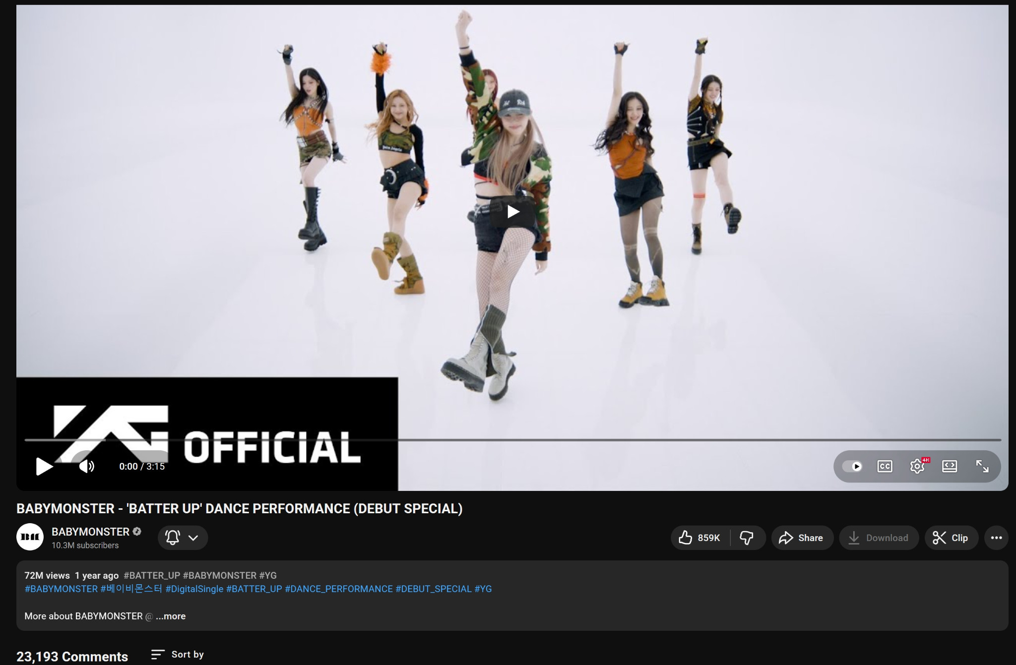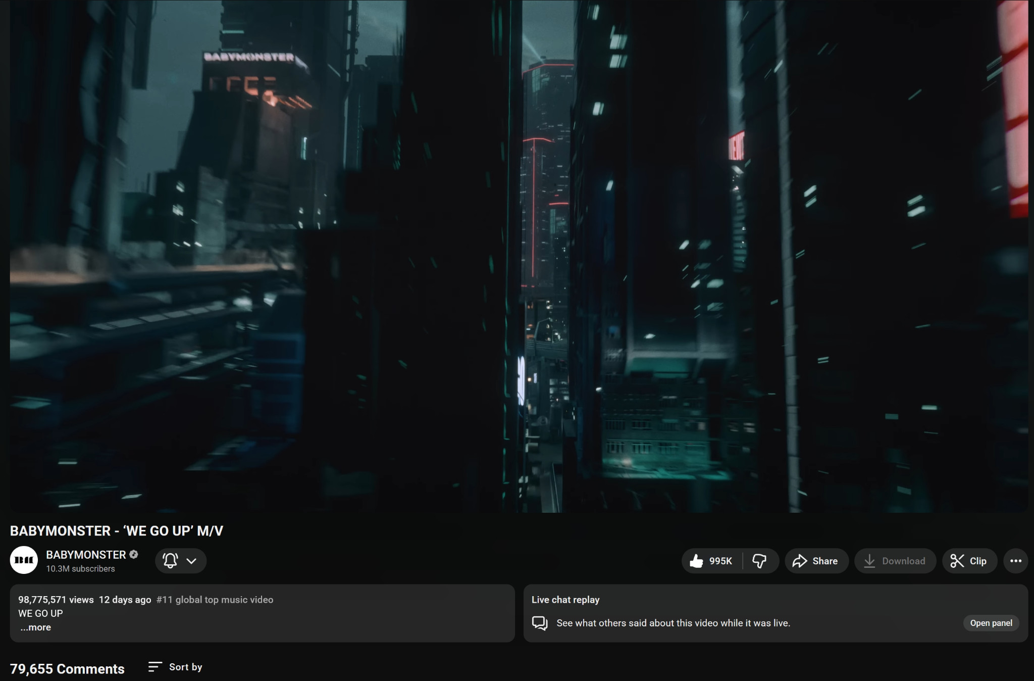 Youtube ก็ยังคงเป็นถิ่นหลักสำหรับ Babymonster อยู่เหมือนเดิม เรียกว่าแทบจะกวาดหมดแผงเลย แม้กระทั่งเพลงล่าสุดอย่าง We Go Up เองก็ขึ้นมาติดอันดับแล้ว ทั้งๆ ที่ปล่อยมาแค่สิบวันเอง วันนี้น่าจะเห็นยอดวิวถึง 100 ล้านได้แล้ว เพราะตอนนี้ 98.78 ล้านวิวแล้วภายในเวลาแค่ 12 วัน ส่วนคลิปเต้นเล็กๆ ของ We go up ก็หยิกหลังไล่มาที่ 74 ล้านวิวแล้ว น่าจะร้อยล้านตามไปในอีกไม่ช้า