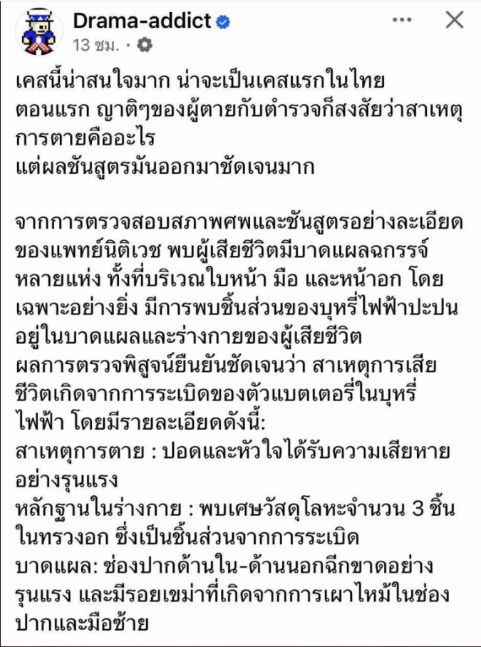 ด้านเพจ "Drama-addict" ได้ให้ความรู้เพิ่มเติมว่า “เคสนี้น่าสนใจมาก น่าจะเป็นเคสแรกในไทย ตอนแรกญาติๆ ของผู้ตายกับตำรวจก็สงสัยว่าสาเหตุการตายคืออะไร แต่ผลชันสูตรมันออกมาชัดเจนมากจากการตรวจสอบสภาพศพและชันสูตรอย่างละเอียดของแพทย์นิติเวช พบผู้เสียชีวิตมีบาดแผลฉกรรจ์หลายแห่ง ทั้งที่บริเวณใบหน้า มือ และหน้าอก โดยเฉพาะอย่างยิ่งมีการพบชิ้นส่วนของบุหรี่ไฟฟ้าปะปนอยู่ในบาดแผลและร่างกายของผู้เสียชีวิต ผลการตรวจพิสูจน์ยืนยันชัดเจนว่าสาเหตุการเสียชีวิตเกิดจากการระเบิดของตัวแบตเตอรี่ในบุหรี่ไฟฟ้า โดยมีรายละเอียดดังนี้ สาเหตุการตาย ปอดและหัวใจได้รับความเสียหายอย่างรุนแรง