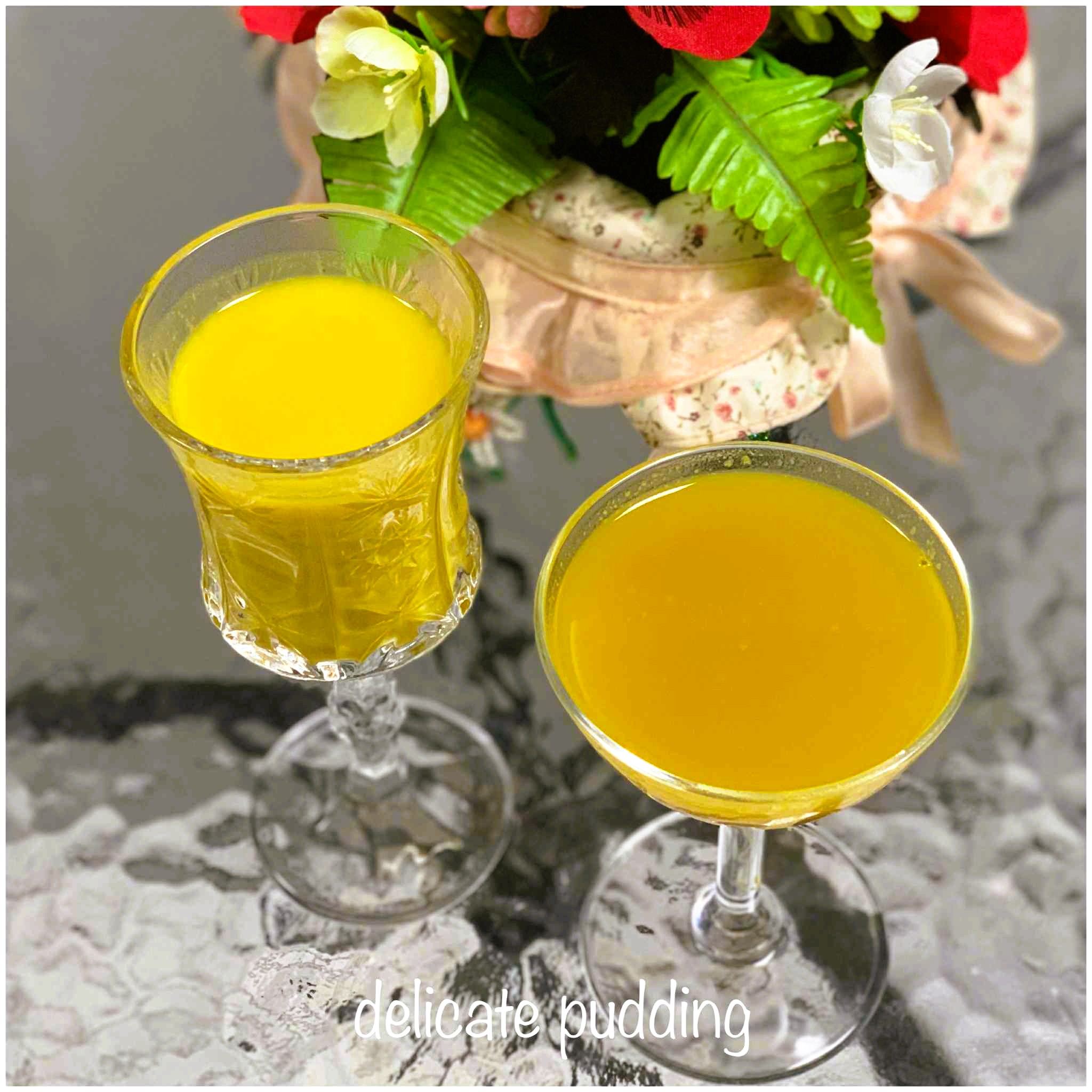 แก้วสีเข้ม คือน้ำข้าวโพด ผสมฟักทองลงไป 1 ชิ้นกระจึ๋ง