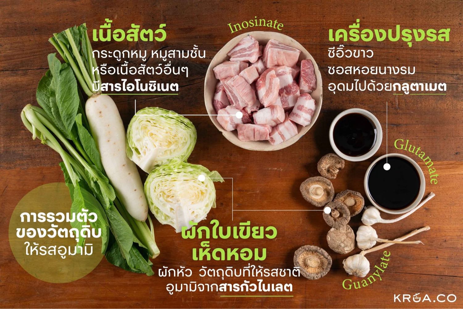 -เนื้อสัตว์ : เช่น กระดูกหมู หมูสามชั้น หรือเนื้อสัตว์อื่นๆ มีสารที่เรียกว่าไอโนซิเนต (Inosinate) ซึ่งเป็นหนึ่งในแหล่งของรสอูมามิ