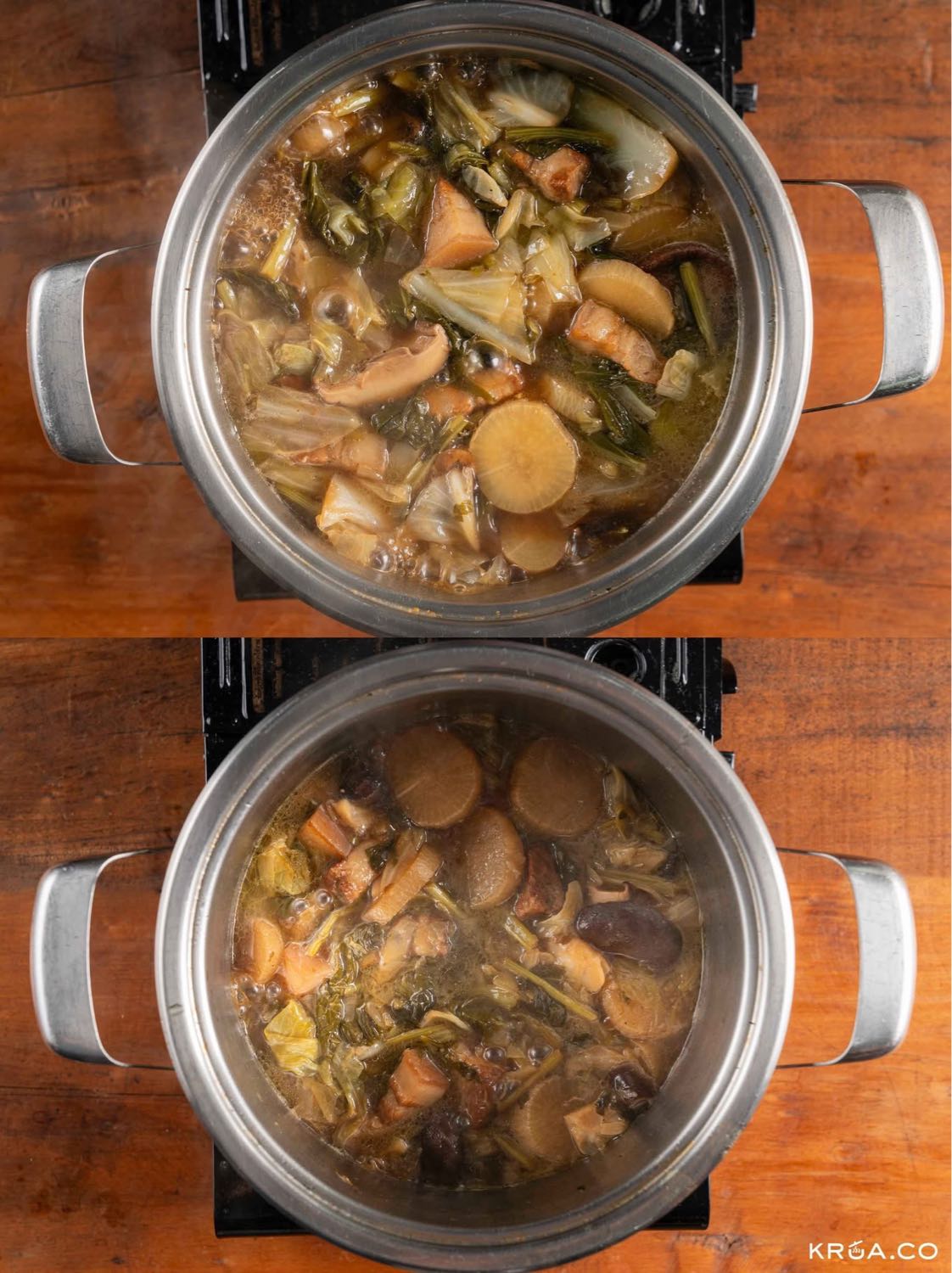 หากเนื้อสัตว์คือพระเอก ผักนานาชนิดก็คือนางเอก และตัวละครสมทบก็คือเครื่องปรุง ในวันแรกที่ทำเสร็จผักอย่างกะหล่ำปลี หัวไชเท้า หรือกวางตุ้ง จะยังคงมีกำแพงเซลล์ที่แข็งแรง สามารถแยกแยะรสของผักแต่ละชนิด รวมถึงรสชาติยังคงแยกส่วนกับน้ำซุปอยู่พอสมควร แต่เมื่อมีการอุ่นด้วยความร้อนที่ยาวนานและต่อเนื่องจะทำให้ผนังเซลล์ของผักต่างๆ อ่อนตัวและสลายลง ทำให้โครงสร้างของผักนุ่มเปื่อย ความหวานตามธรรมชาติที่ซ่อนอยู่ก็จะถูกปลดปล่อยออกมาอย่างเต็มที่ทำให้น้ำซุปมีมิติของรสหวานที่ซับซ้อนและนุ่มนวล ในขณะเดียวกัน เมื่อโครงสร้างของผักนุ่มลงมันก็จะทำตัวเหมือนฟองน้ำ ค่อยๆ ดูดซับเอารสชาติอูมามิจากเนื้อสัตว์ ความเค็มกลมกล่อมจากซีอิ๊ว และความอร่อยของเจลาตินในน้ำซุปเข้ามาไว้ในตัวเอง