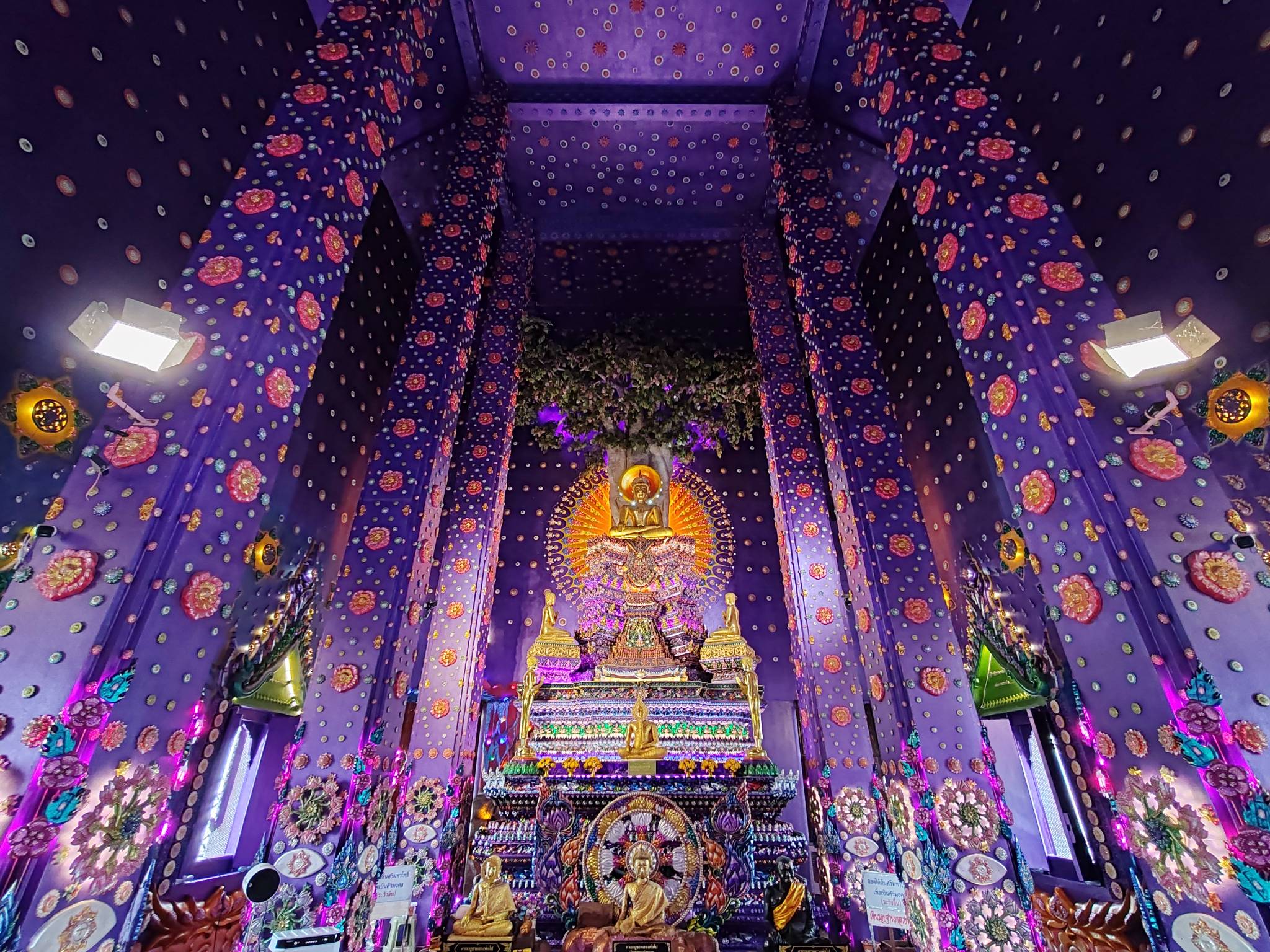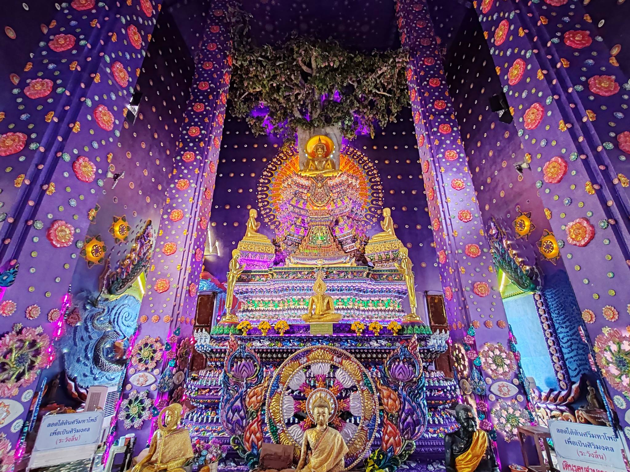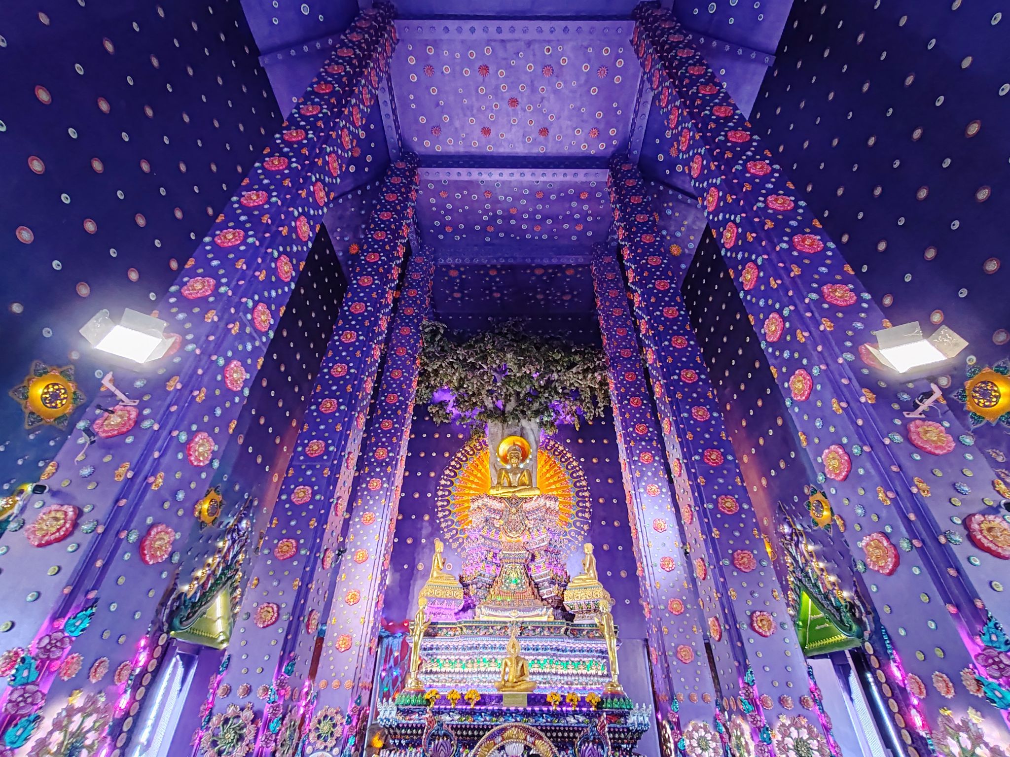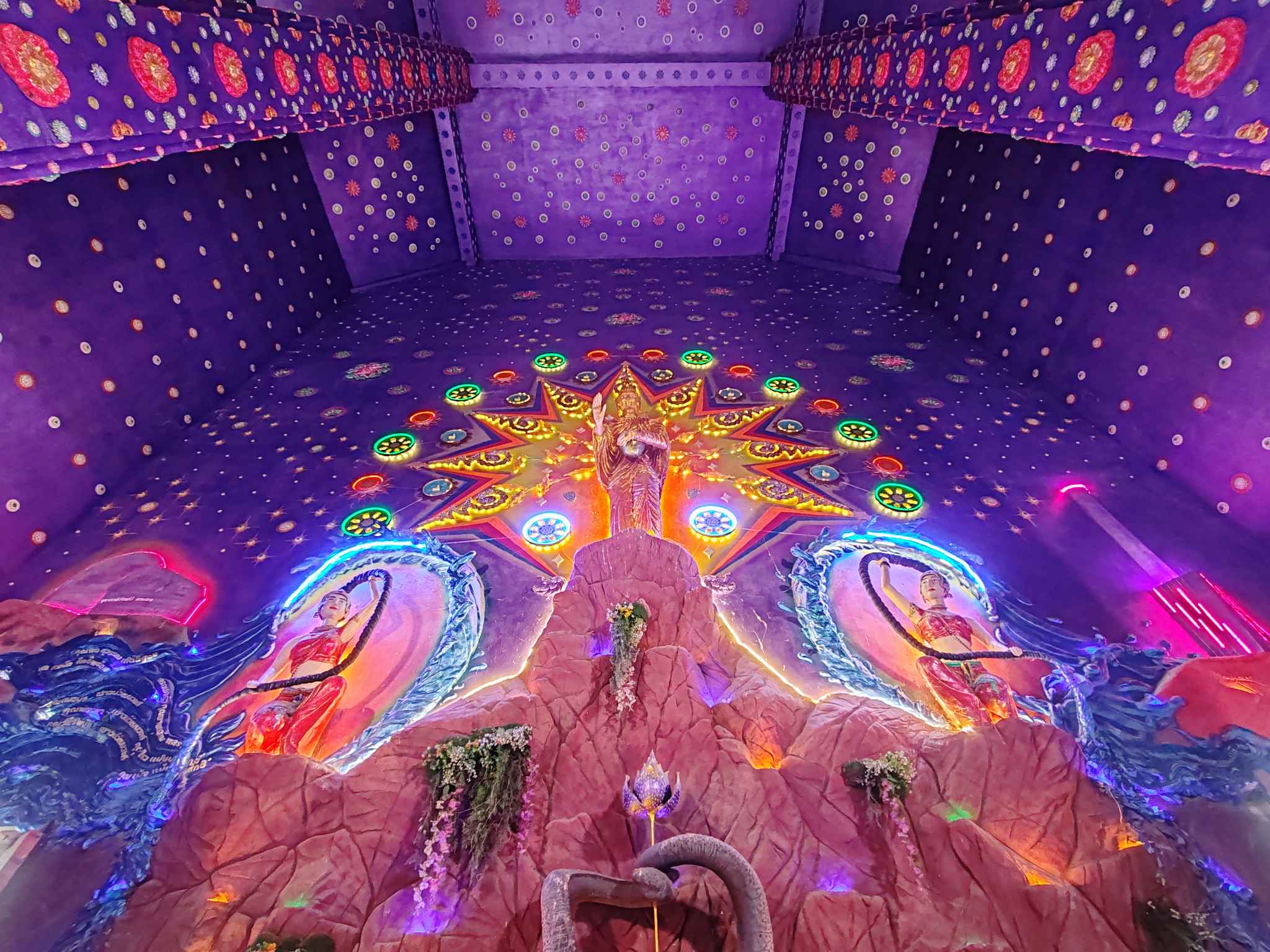 ภายในโบสถ์ สีม่วงโดดเด่นมาก ตกแต่งประณีตด้วยเพชรและโมเสกระยิบระยับ ประดับด้วยไฟที่มีสีสัน สวยงามครับ