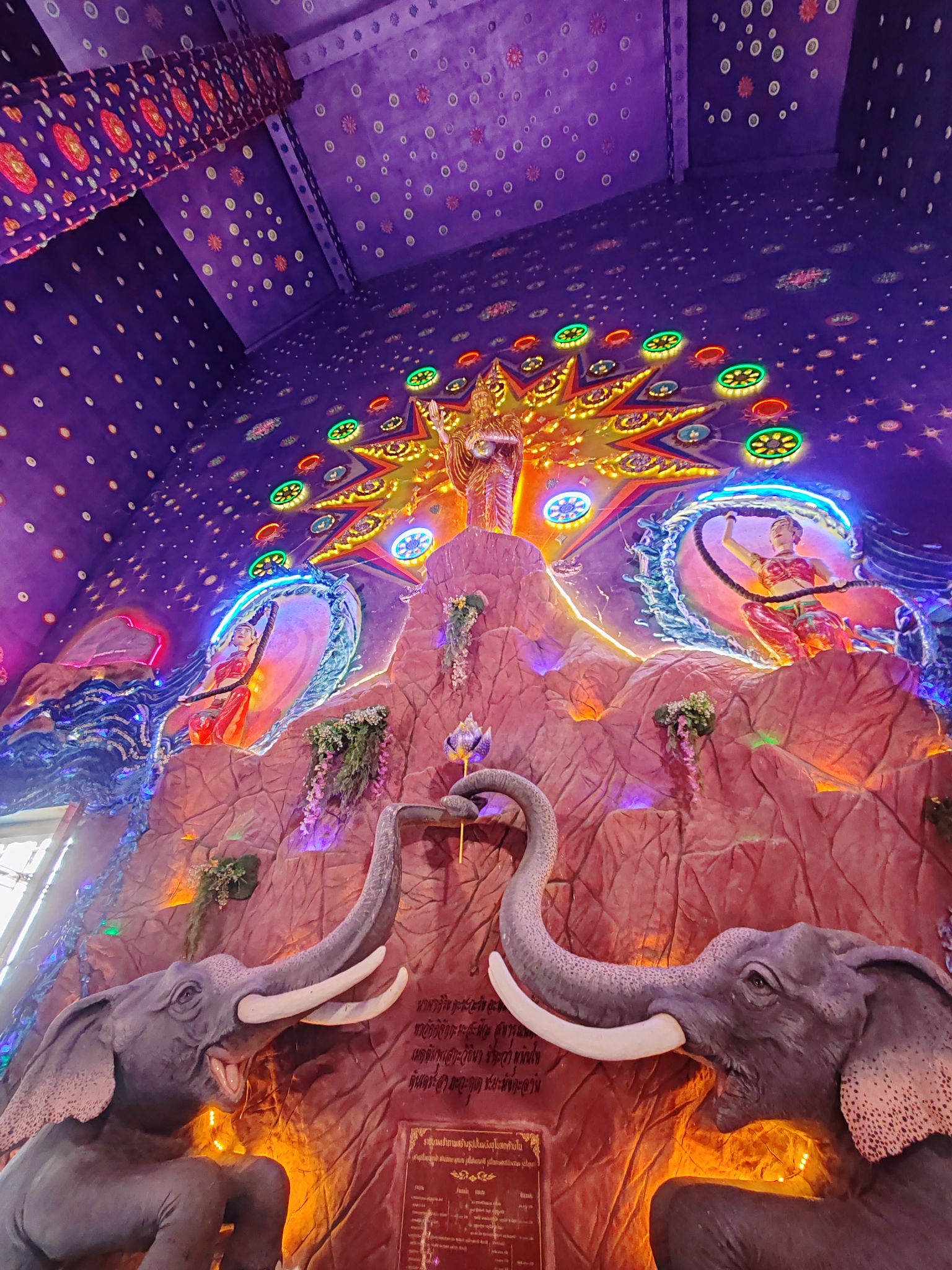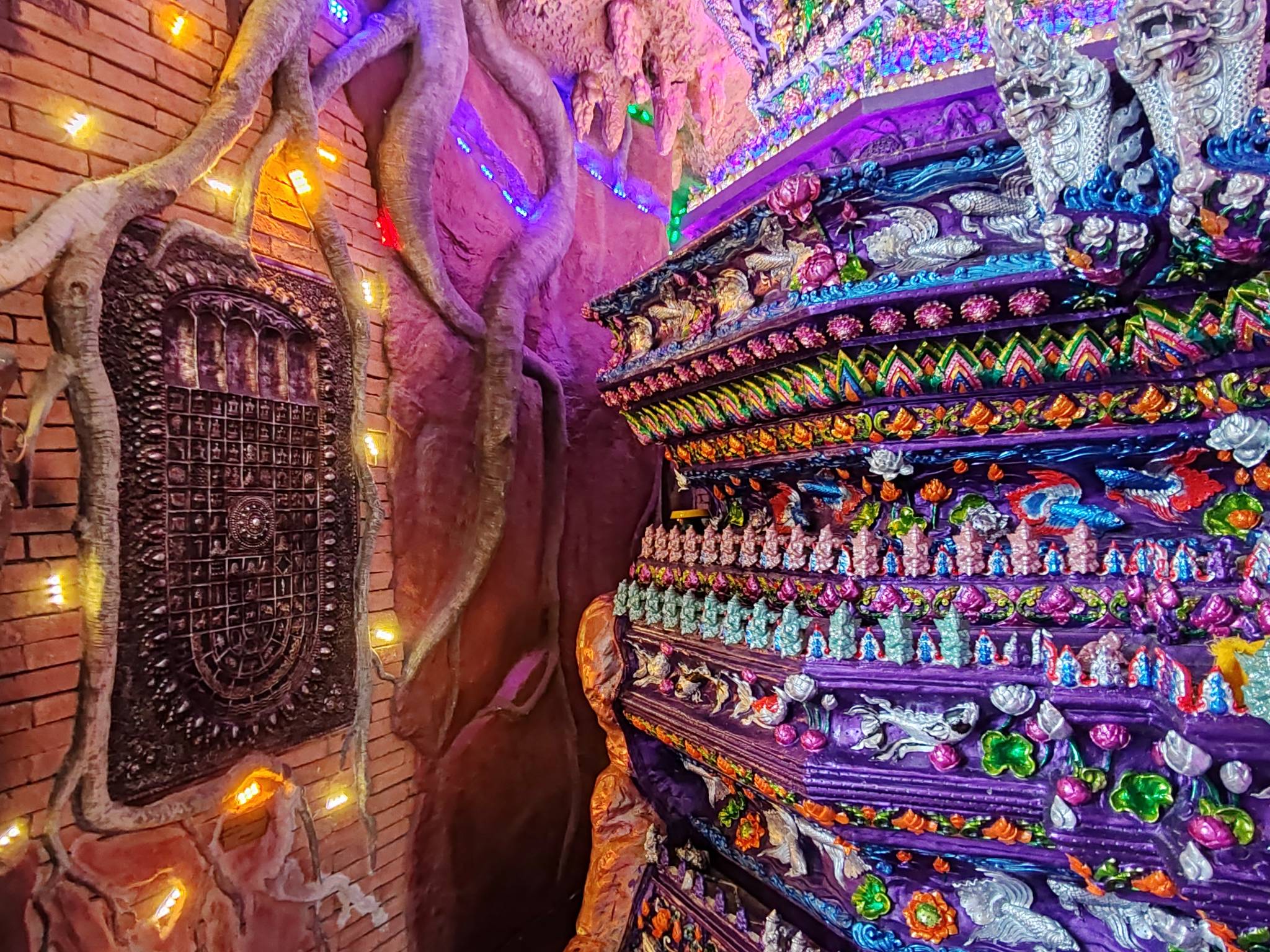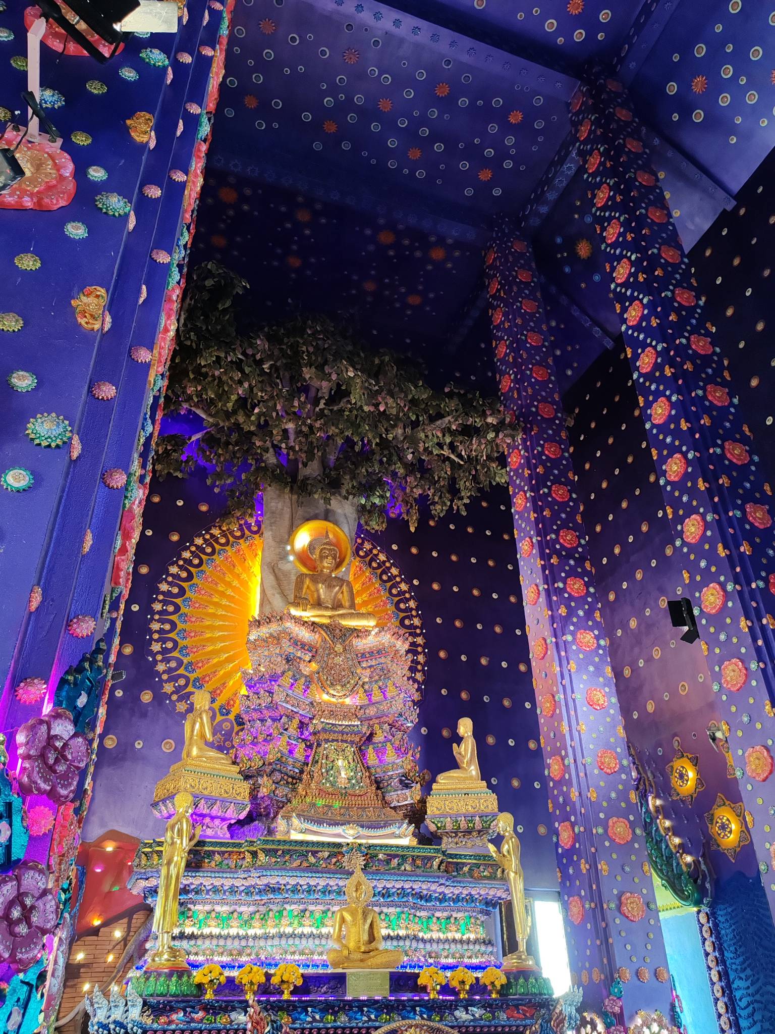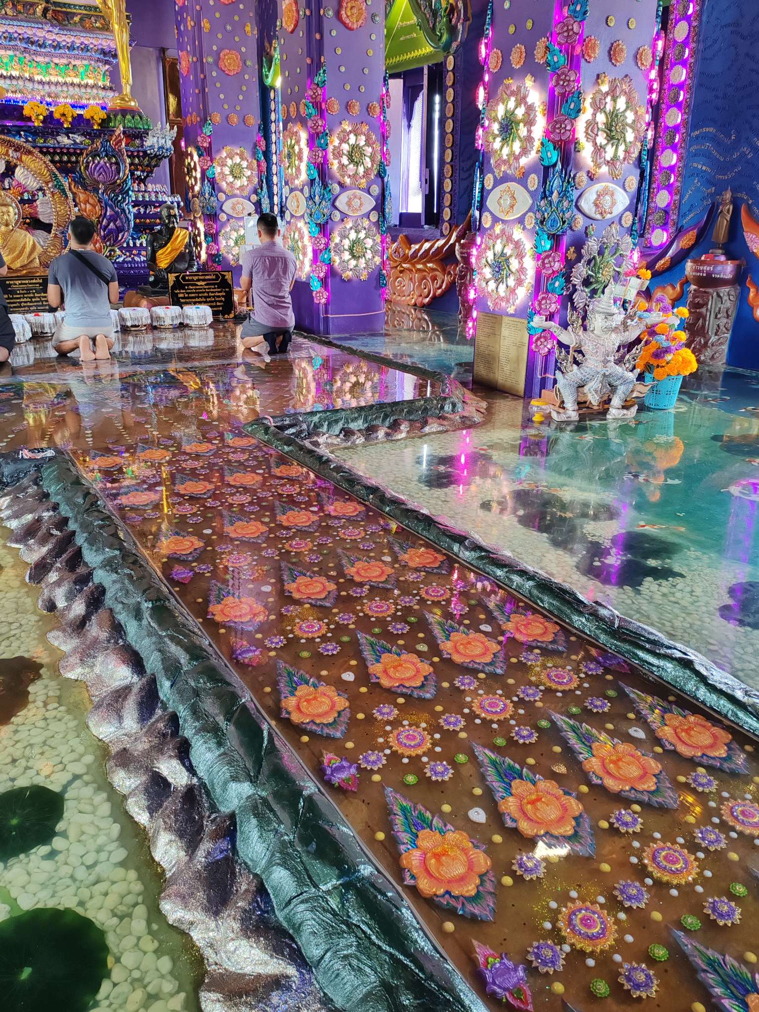 ภายในโบสถ์ สีม่วงโดดเด่นมาก ตกแต่งประณีตด้วยเพชรและโมเสกระยิบระยับ ประดับด้วยไฟที่มีสีสัน สวยงามครับ