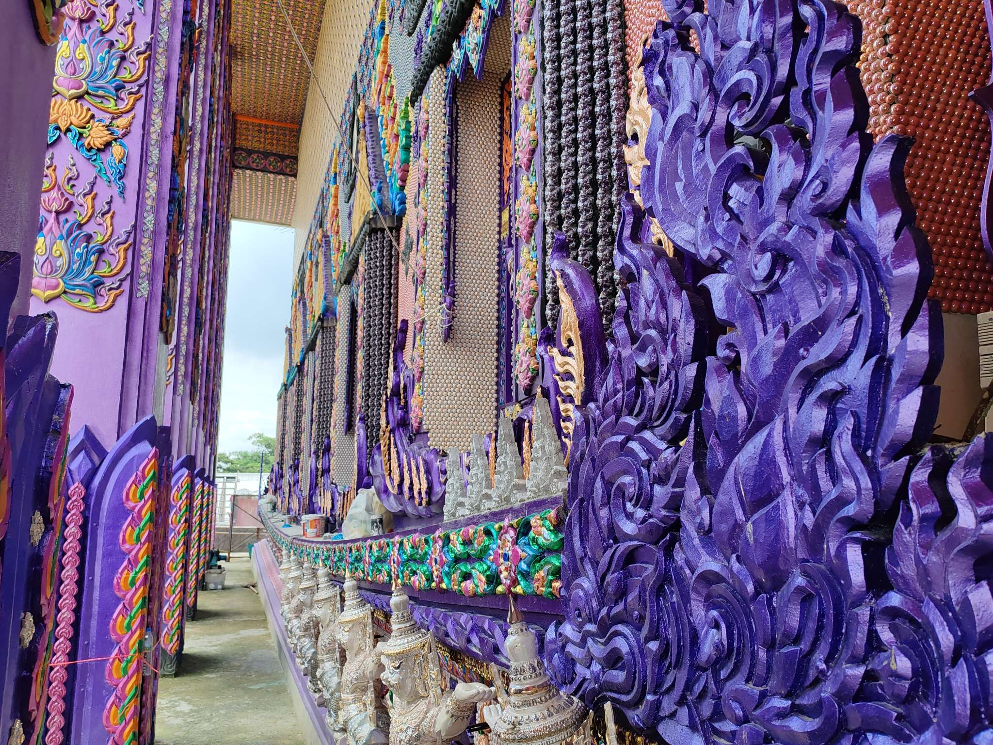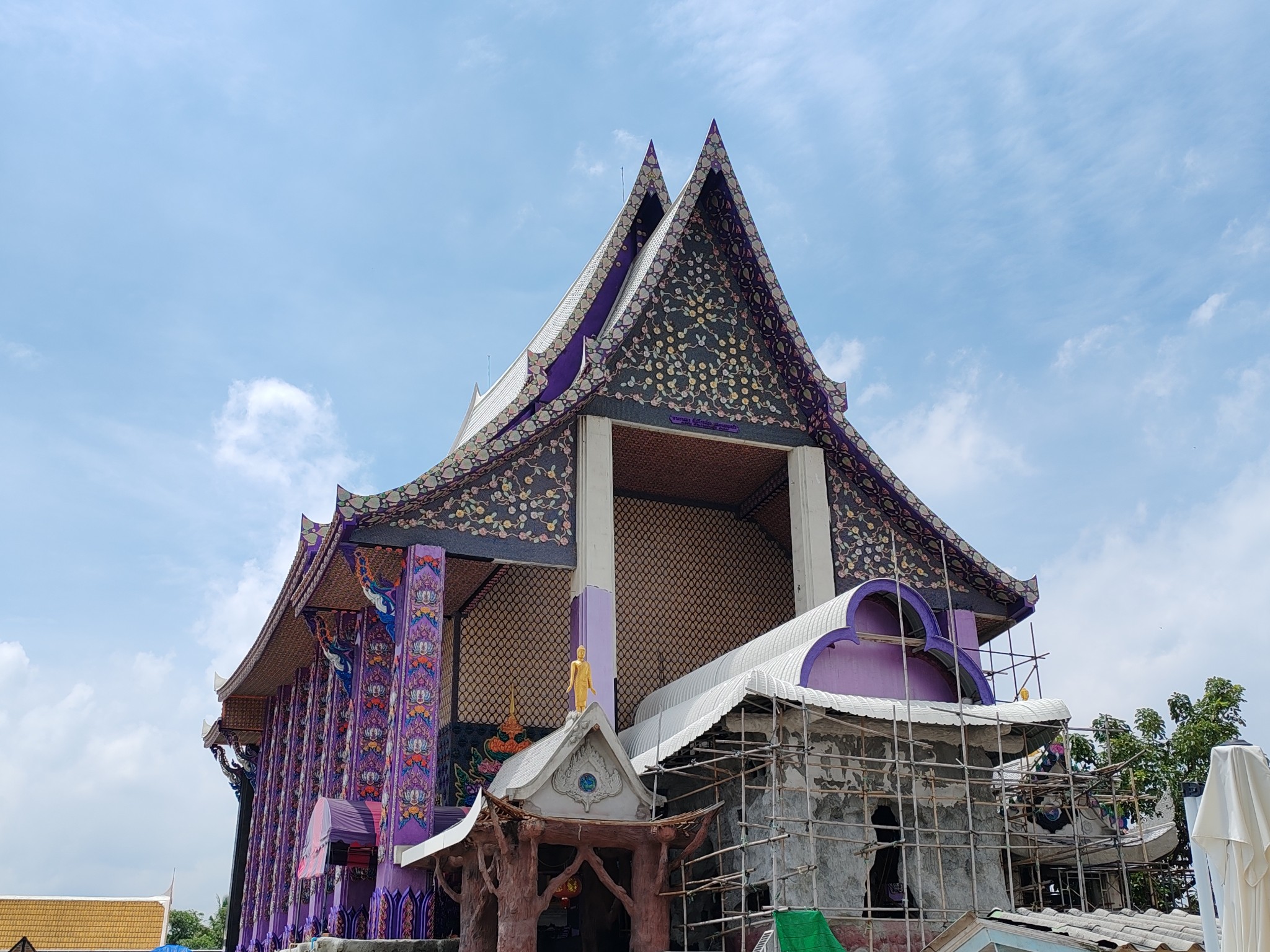 การตกแต่ง ใช้สีม่วงเป็นสีหลัก ลวดลายปูนปั้นก็ทำกันเองโดยพระสงฆ์ในวัด ค่อยๆทำกันครับ
