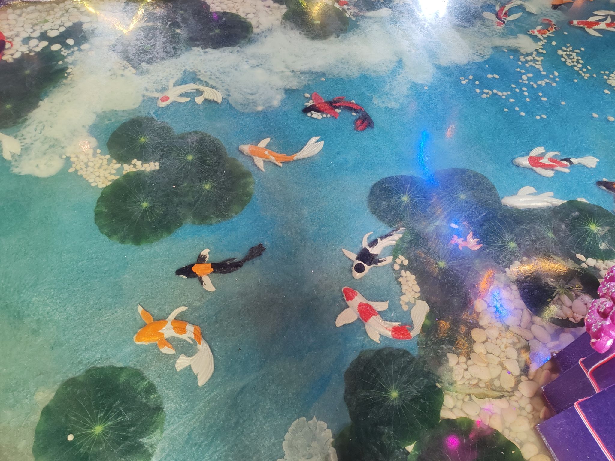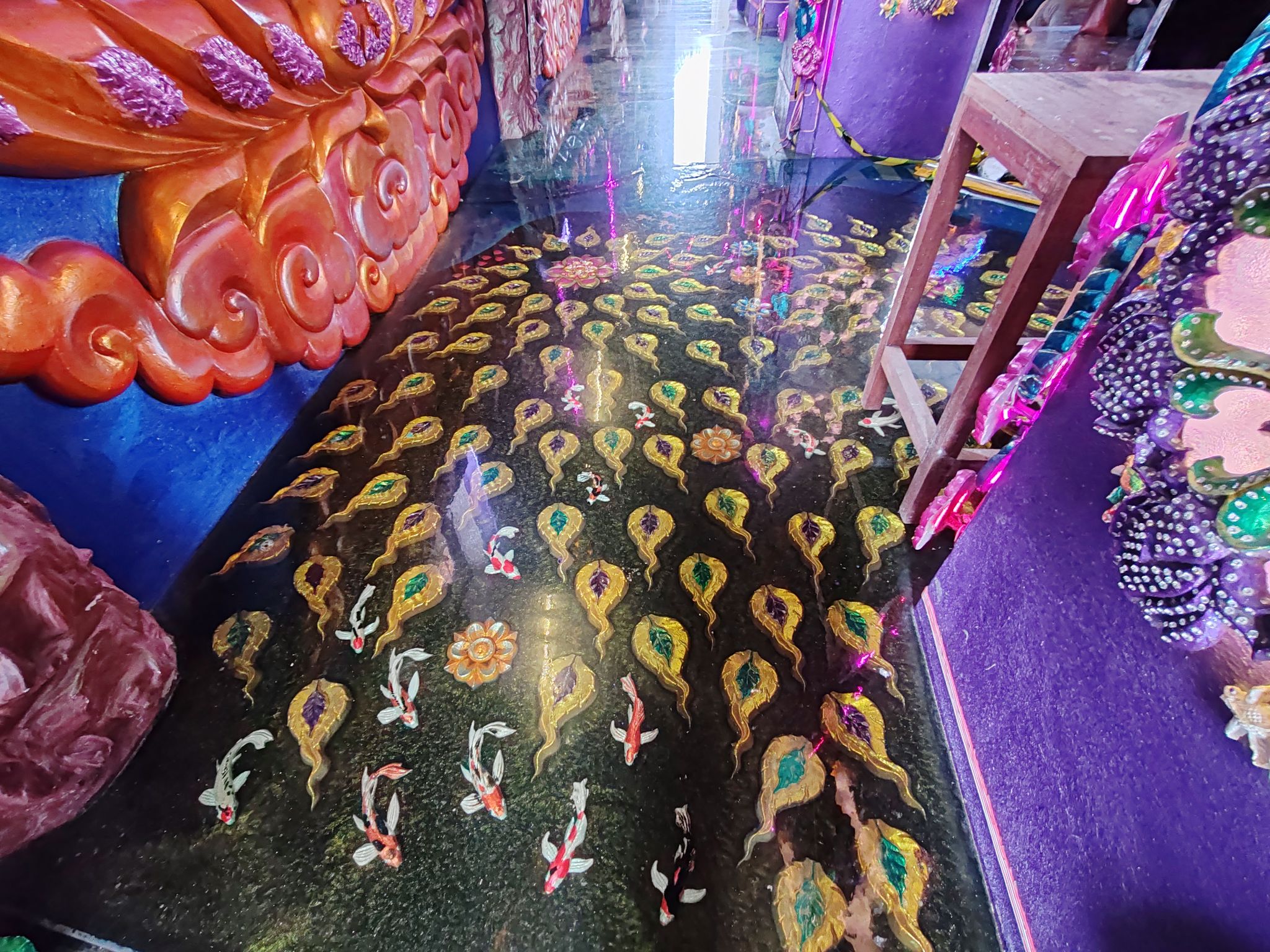 พื้นอุโบสถจะมี ลวดลายของปลา ดอกบัว บนพื้นทางเดินในภายในโบสถ์ที่เคลือบด้วยเรซิน ให้ความรู้สึกเหมือนอยู่บนเรือท้องกระจกห้องใหญ่