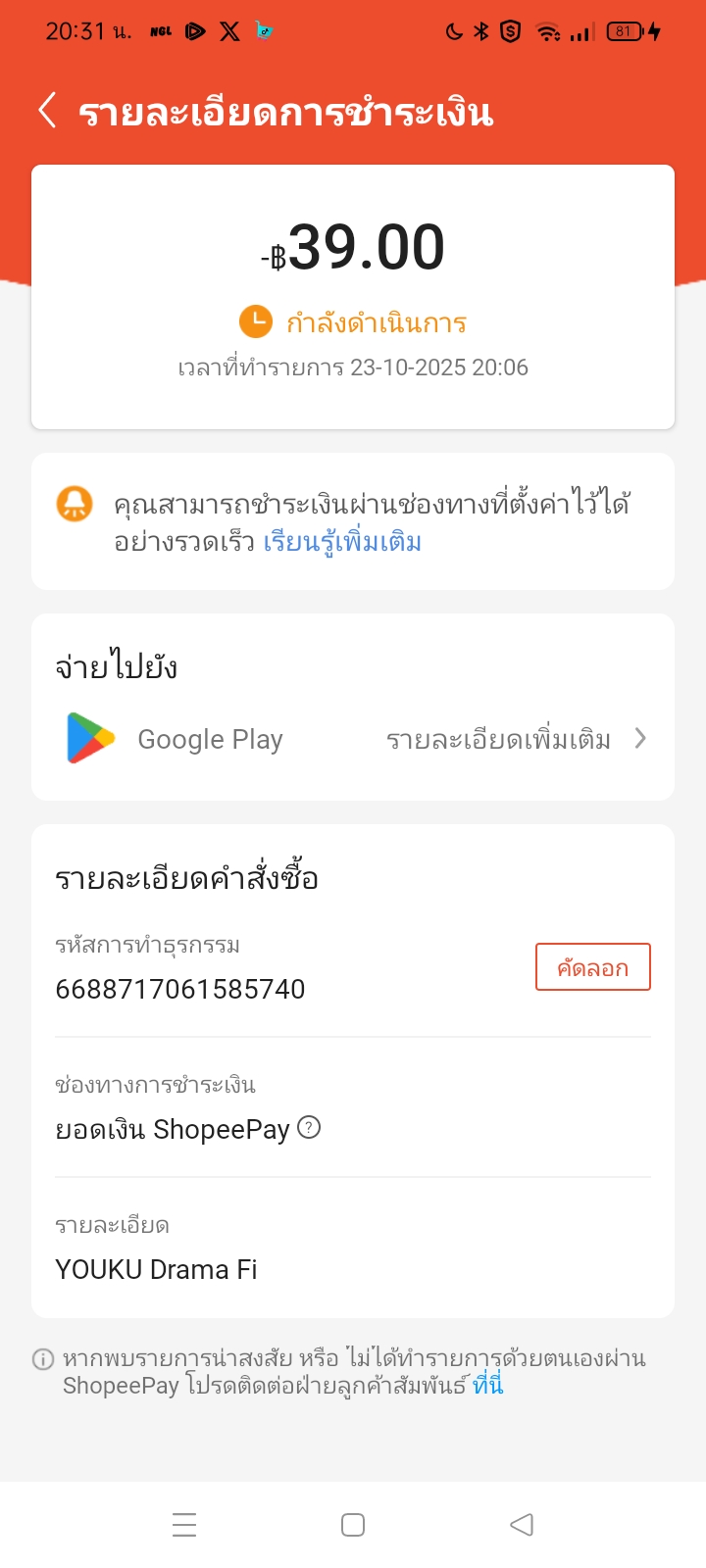 ShopeePayหักเงินในบัญชีไปแล้วแต่ขึ้นกำลังดำเนินการ