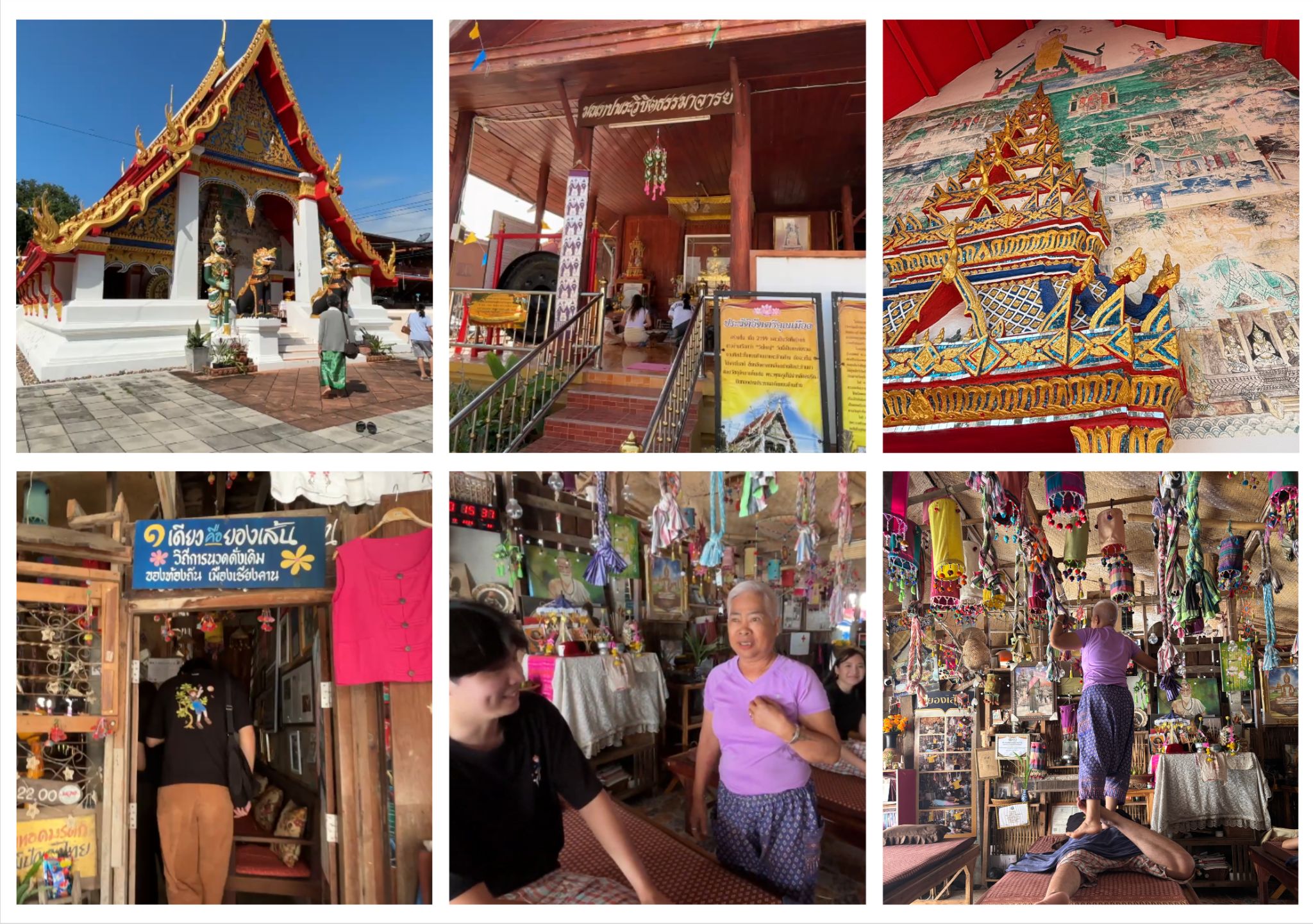 ต่อจากนั้นประมาณ 9 โมง เราเดินไปไหว้พระที่วัดศรีคุณเมือง ไหว้พระ 3 จุดภายในวัด ทั้งพระประธานและองค์พระรอบ ๆ ศาลา แล้วค่อยกลับมาที่พัก ใช้จักรยานของที่พักปั่นไปที่ร้านนวดโยงเส้นป้าก้อย ซ.20 ป้าก้อยเป็นคนอารมณ์ดีมาก คุยสนุก เป็นกันเองสุด ๆ เราแนะนำตัวว่าเป็นนักศึกษา แกก็เล่าให้ฟังถึงที่มาของการนวดโยงเส้น ประโยชน์ และรางวัลที่เคยได้รับมาต่าง ๆ เราลองนวดกัน 1 ชั่วโมง แกใจดีมากเพราะเห็นเราเป็นเด็ก ๆ มาศึกษาวิถีชีวิต เลยคิดราคาเพียง 200 บาท/คน เท่านั้นเองค่ะ