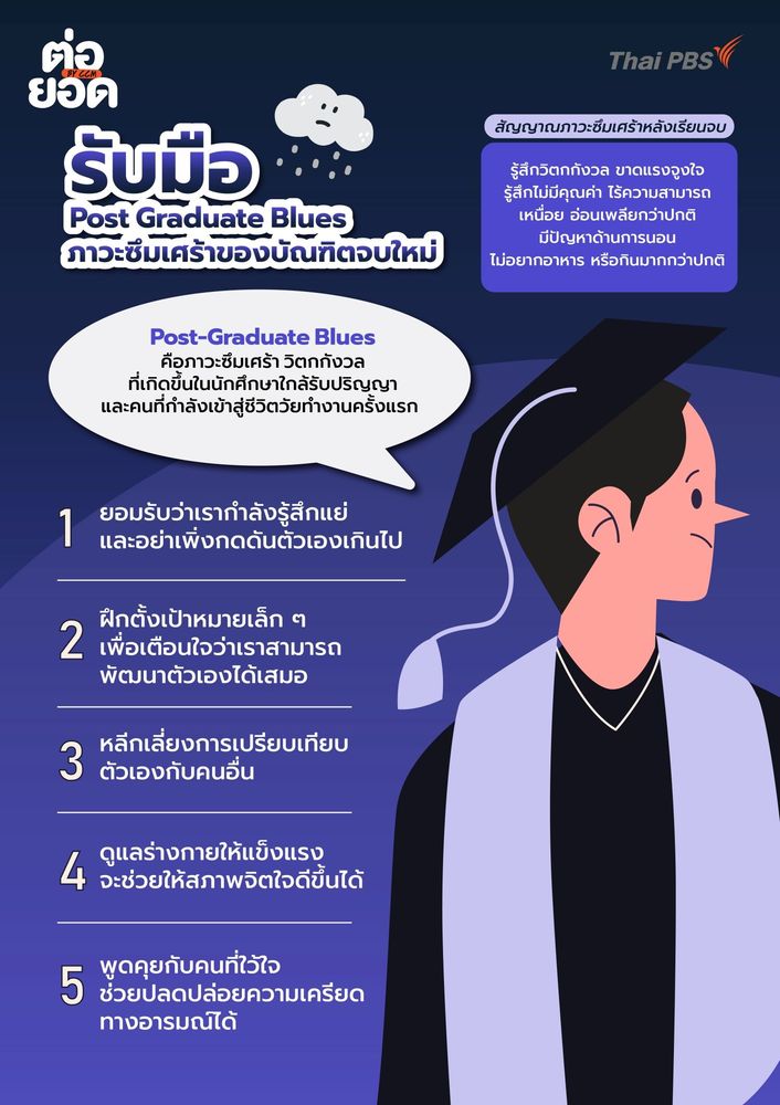 “จะได้งานตรงสายไหม? ชีวิตจะเดินต่ออย่างไร?” แม้ว่าช่วงเวลาของการโหมอ่านหนังสือสอบหรือปั่นโพรเจกต์จนโต้รุ่งจะผ่านไปแล้ว แต่บัณฑิตจบใหม่หลายคนกลับไม่ได้รู้สึกผ่อนคลาย แต่กลับเต็มไปด้วยความเศร้า กังวล และสับสน เหมือนกำลังหลงทาง อาการเหล่านี้มีชื่อเรียกว่า Post-Graduate Blues หรือภาวะซึมเศร้าและวิตกกังวล ที่เกิดขึ้นกับนักศึกษาที่ใกล้สำเร็จการศึกษา ไปจนถึงผู้ที่เพิ่งก้าวเข้าสู่ชีวิตการทำงานครั้งแรก