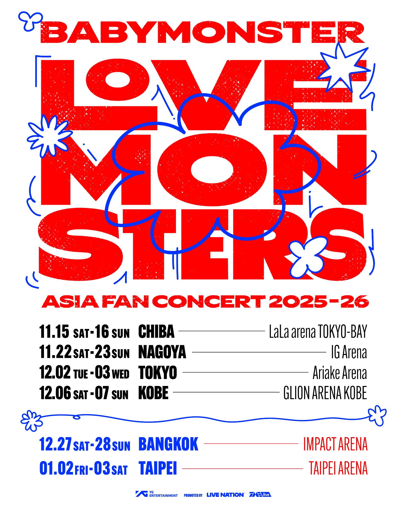 BABYMONSTER “LOVE MONSTERS” ASIA FAN CONCERT 2025-26 ANNOUNCEMENT ▶️2025.11.15(SAT)-2025.11.16(SUN) : CHIBA ▶️2025.11.22(SAT)-2025.11.23(SUN) : NAGOYA ▶️2025.12.02(TUE)-2025.12.03(WED) :