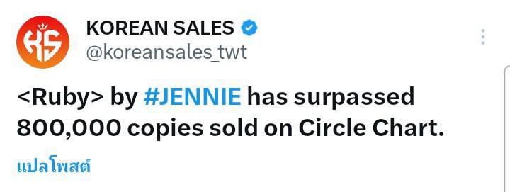 นอกจากนี้อัลบั้ม Ruby ของ JENNIE ยังเป็นอัลบั้มเคป็อปที่ขายดีที่สุดในปี 2025 ทั่วโลก โดยมียอดขายมากกว่า 4.4 ล้านยูนิต (โดย Chartmasters) 🌎❤️🔥