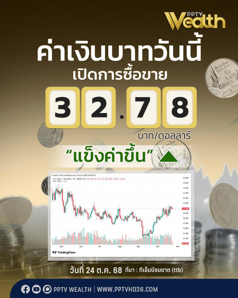 วันที่ 24 ต.ค. 68 ฝ่ายธุรกิจตลาดเงินและธุรกรรมระหว่างประเทศ ทีเอ็มบีธนชาต (ttb) เปิดเผยว่า ค่าเงินบาทเช้านี้เปิดตลาด 32.78 บาท/ดอลลาร์ เแข็งค่าจากราคาปิดตลาดเมื่อวันพุธที่ระดับ 32.90 บาท/ดอลลาร์