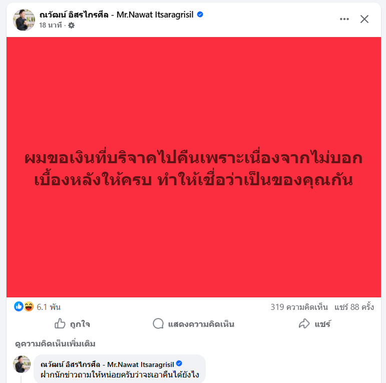 "ผมขอเงินที่บริจาคไปคืนเพราะเนื่องจากไม่บอกเบื้องหลังให้ครบ ทำให้เชื่อว่าเป็นของคุณกัน" บอสณวัฒน์ ยังบอกอีกว่า