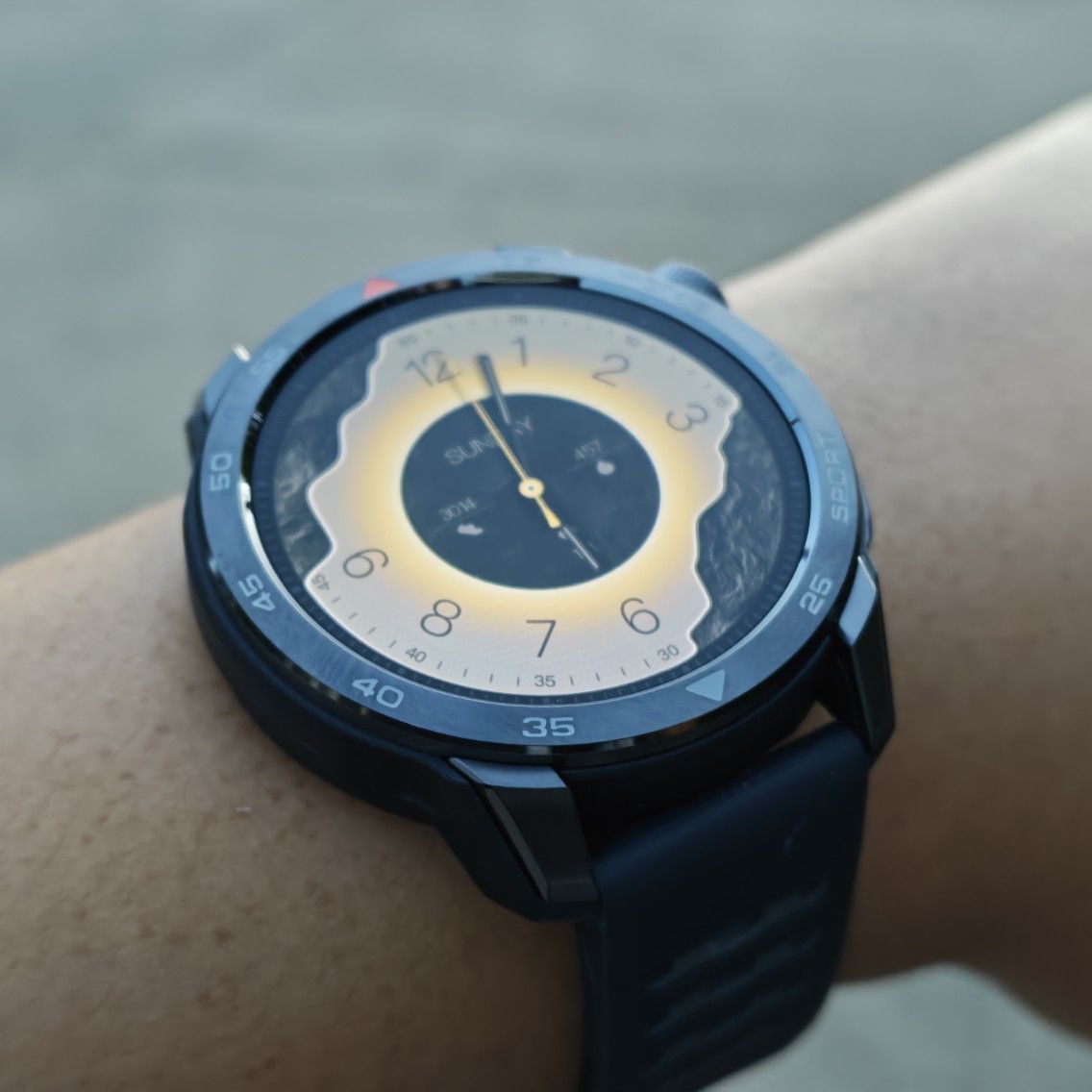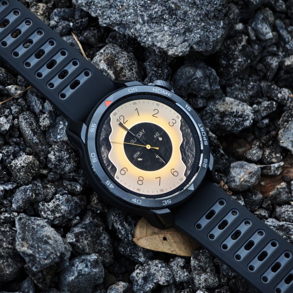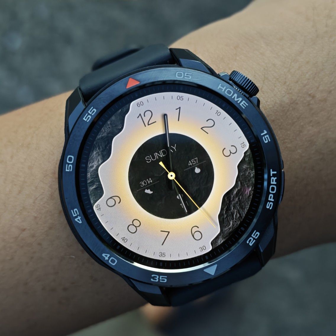 - ตัวเรือนจะเป็นจะออกแนวลุยๆ ตรง Bezel เป็นสเตนเลส 316L ทำ CNC ตัดมุมแบบสวย วงแหวนจะบอกเลขนาทีครับ ด้านข้างจะมี 2 ปุ่มคือ เม็ดมะยมทำงานเป็นปุ่ม Home สามารถใช้งานหมุนได้ กดได้ แล้วก็ปุ่ม Sport ถ้าค่า Default จะเข้าโหมดออกกำลังกาย สามารถเปลี่ยนเป็นเมนูอื่นได้ที่นาฬิกาครับ ตัวเรือนทำมาจากไฟเบอร์กลาสอย่างดี เป็นผิวแบบด้าน ข้อดีของมันคือแข็งแรง ไม่เป็นรอยง่าย น้ำหนักเบา พอน้ำหนักเบา เราก็จะใส่ได้นานขึ้น ไม่รู้สึกตึงมือเท่าไหร่ครับ